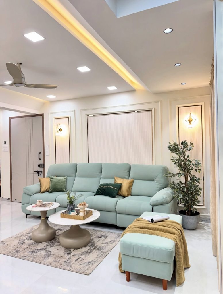 The Living Room illustrates how modern minimalism can go beyond neutrals while still feeling harmoniously composed. The mint color of the sofa offers a brightness touch that enhances the relief feeling of the atmosphere in an uptown apartment. The elegant emerald accents add to the enchantment of the apartment. The furniture, consisting of oval nesting tables, contributes to the charm sculpturally. The streamlined design of the ceiling light keeps the architecture without cluttering the visual space. The color palette of the furniture in the room stays neutral and reticent; therefore, the owners are reminded that minimalism is not something that requires an absence of color, just the opposite. It is of the essence. The ideas in the room blend minimal design and engaging color in a joyfully intimate atmosphere. This space is very appropriate for developers.