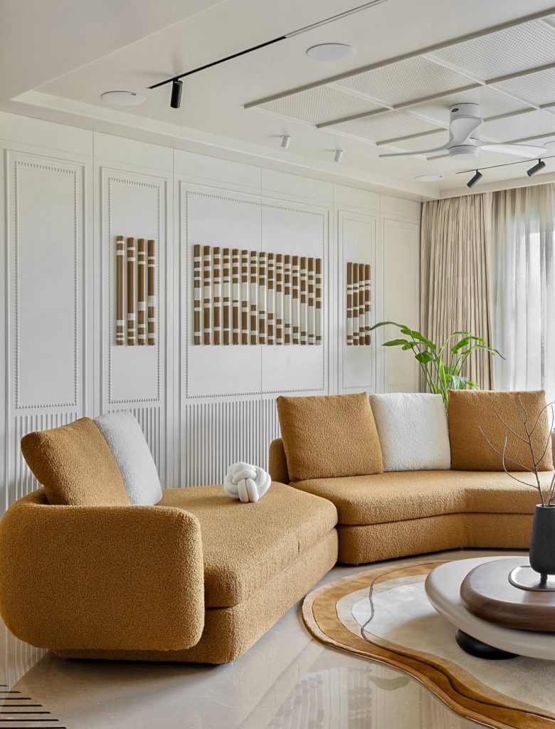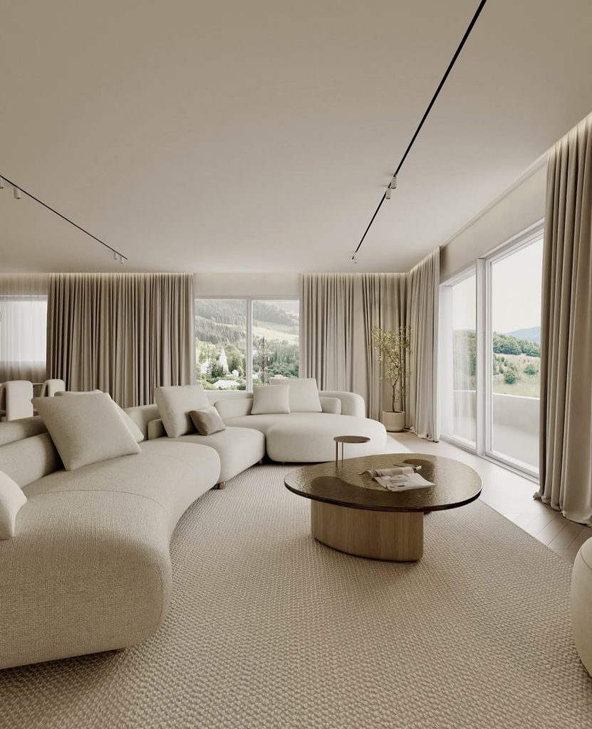 This serene living space takes cues from nature and slow-living retreats, resulting in a deeply restorative take on minimalism. The sweeping curves of the modular sofa echo the surrounding landscape, visible through the expansive windows, while the muted beige palette reinforces a sense of sanctuary. Soft textures—from the woven rug to the velvety upholstery—create a subtle earthy rhythm that feels quietly luxurious. Instead of decorative excess, the room relies on proportion, light, and gentle shadow to create ambiance. It’s the kind of space that reflects a growing desire for tranquility and intentional living—values shaping many design inspiration trends today.