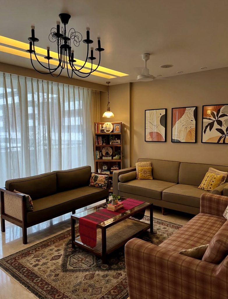This room blends mid-century structure with warm minimalism, resulting in a space that feels collected rather than overly polished. Earth-tone sofas, patterned pillows, and a traditional rug introduce a subtly bohemian rhythm while still maintaining a clean layout. The lighting—especially the understated chandelier—adds depth without creating visual clutter, a smart touch for anyone trying to balance simplicity with character. The muted palette leans into grey and clay tones, making the room feel grounded yet adaptable to changing seasons. It’s a great example of minimalist living that honors comfort and tradition alongside modern design inspiration.