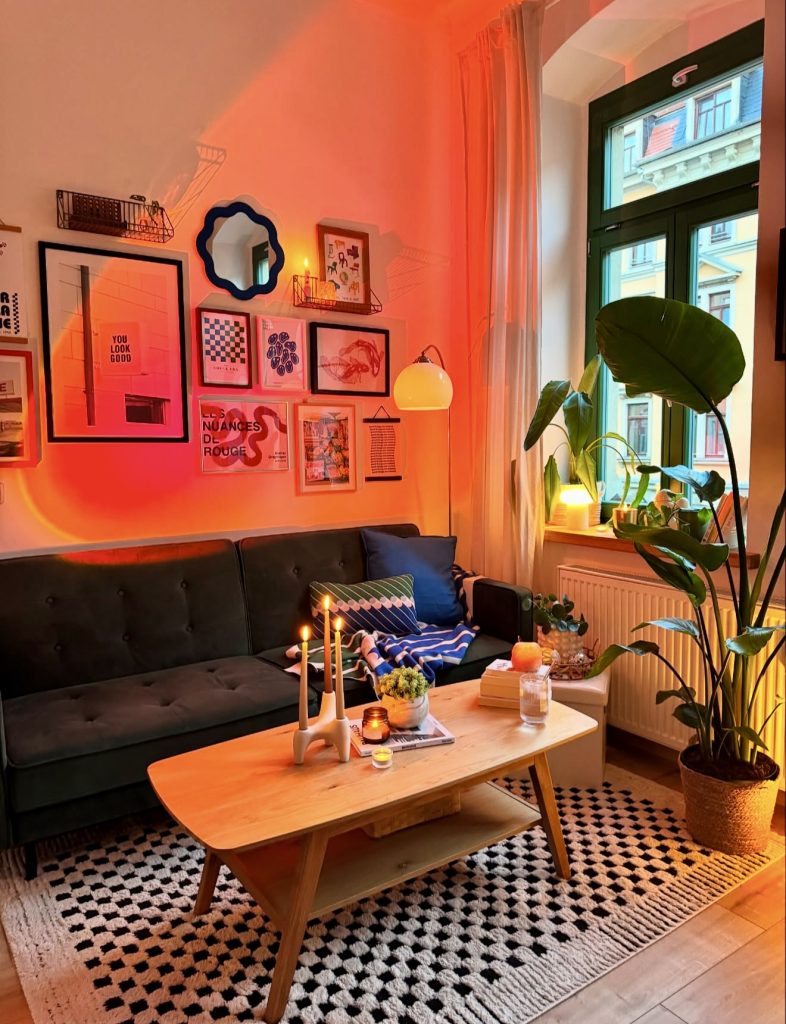 This vibrant urban living room proves that minimalism in 2026 doesn’t have to mean drained color palettes or strict monotony. Here, warm lighting and curated art introduce a moody, expressive energy, while the furniture layout stays streamlined enough to feel minimal. The clean-lined sofa and simple wooden table keep the foundation calm, allowing the colorful gallery wall and soft candlelight to bring depth and personality. It’s a wonderful reference point for anyone wanting ideas that merge minimal structure with bold expression—especially renters decorating a small apartment who want to make an impact without clutter.