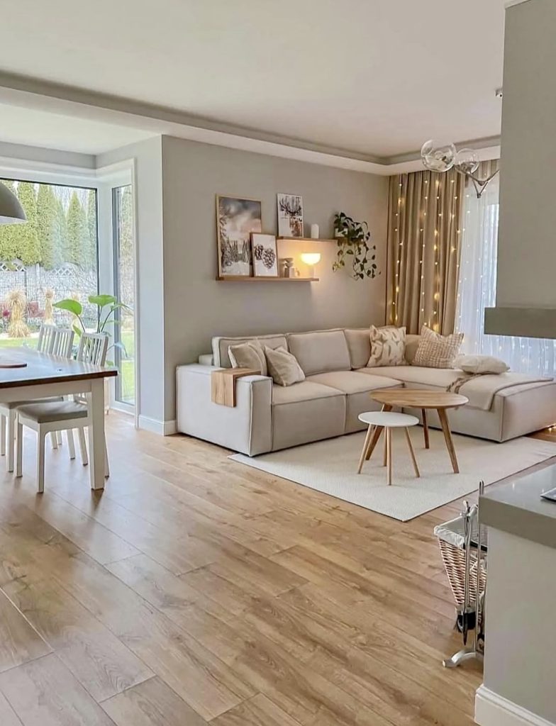 This open-concept living room shows how minimalism can feel wonderfully cozy without adding unnecessary visual weight, especially when the palette leans toward soft neutral creams and greys. The sectional anchors the space with a relaxed, approachable shape, while the light wood flooring and simple nesting tables create a naturally earthy rhythm throughout. What makes this room especially appealing for many U.S. homeowners is its effortless flow into the dining area, a layout that supports everyday living as much as it does weekend hosting. Subtle layered elements—like warm string lights, gently framed art, and a single trailing plant—add personality without disrupting the room’s quiet design. It’s a gentle reminder that minimalism in 2026 can feel both edited and deeply livable.