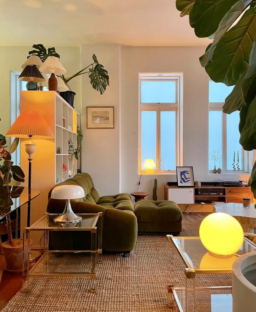 This room leans into a more expressive form of minimalism, one where curated objects and sculptural lighting introduce a lively personality without slipping into clutter. The deep green sofa adds a moody, grounding element, balanced by airy shelving and oversized plants that lend a subtly bohemian undertone. What keeps the space minimal is the thoughtful editing: clean lines, open surfaces, and a restrained mix of materials. The warm glow from the assortment of lamps brings a nostalgic comfort that feels especially relevant for younger urban dwellers seeking inspiration for small apartment living. It’s contemporary, a bit eclectic, and full of quiet, joyful design choices that make the room feel like a true sanctuary.