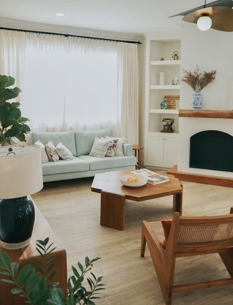 This bright space reflects a blend of mid-century elegance and modern restraint, shaped by warm wood tones and clean architectural lines. The mint-colored sofa introduces soft volume without overpowering the space, while the geometric coffee table and cane accent chair echo classic mid-century forms. The white built-ins and fireplace create a visual anchor, proving how a minimalist layout can still feel layered and full of character with the right balance of textures. For anyone interested in ideas for 2026, this room is a reminder that minimalism doesn’t need to be stark—it can be natural, curated, and infused with subtle boho touches. The overall effect is calm, welcoming, and deeply rooted in timeless design inspiration.