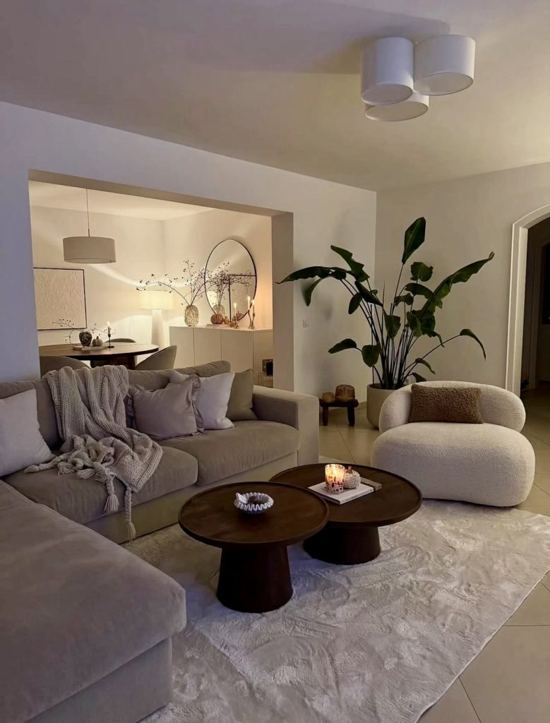 This softly lit space captures the warm intimacy that many people crave in a cozy boho minimalist interior. The plush sectional, boucle accent chair, and layered candles create a peaceful nighttime atmosphere without introducing excessive ornamentation. Rounded tables and a neutral rug maintain a clean visual flow while still incorporating organic shapes that feel tactile and grounding. The room opens gracefully into a dining nook, demonstrating how thoughtful lighting and tone-on-tone styling can help define zones without relying on heavy décor. This aesthetic feels perfect for those who want cozy, inward-looking nights at home while still keeping their space aligned with modern Scandinavian and contemporary influences.