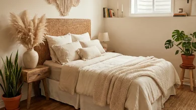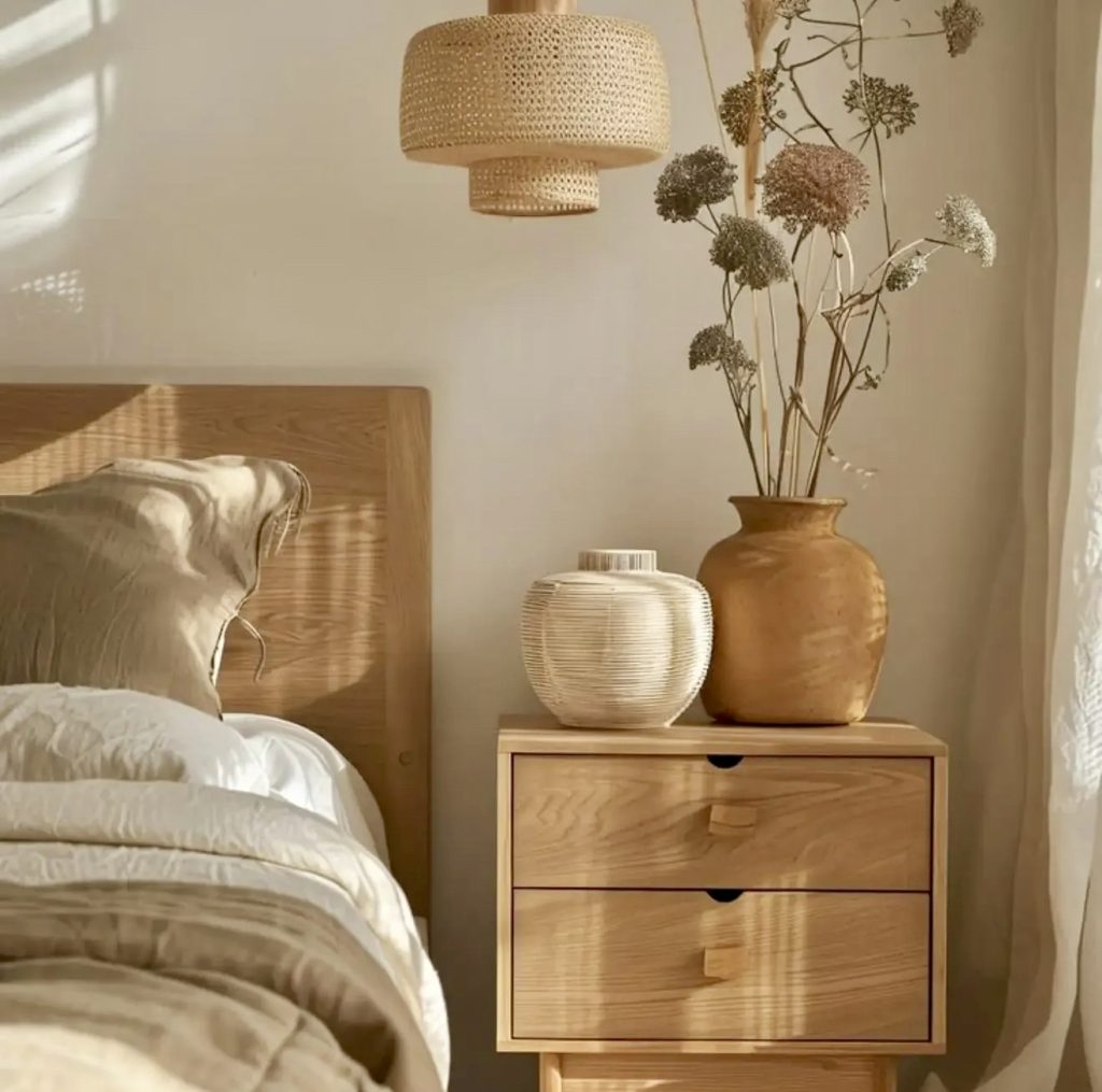 This space embodies the tranquility of organic modern living, using warm oak tones, soft bedding, and sunlight to shape a soothing environment. The natural wood nightstand and bedframe deliver a subtle mid-century nod, but the styling stays clean and minimalist, relying on sculptural vases and dried botanicals instead of clutter. It’s the kind of bedroom that instantly slows your pulse—a reminder that good interior design doesn’t have to shout to feel special. Homes across the U.S. are shifting toward these gentle, earthy palettes because they promote rest and mental clarity. A woven pendant light adds a soft rustic influence without pushing the look too far into rustic territory, striking that perfect balance between simplicity and warmth.
