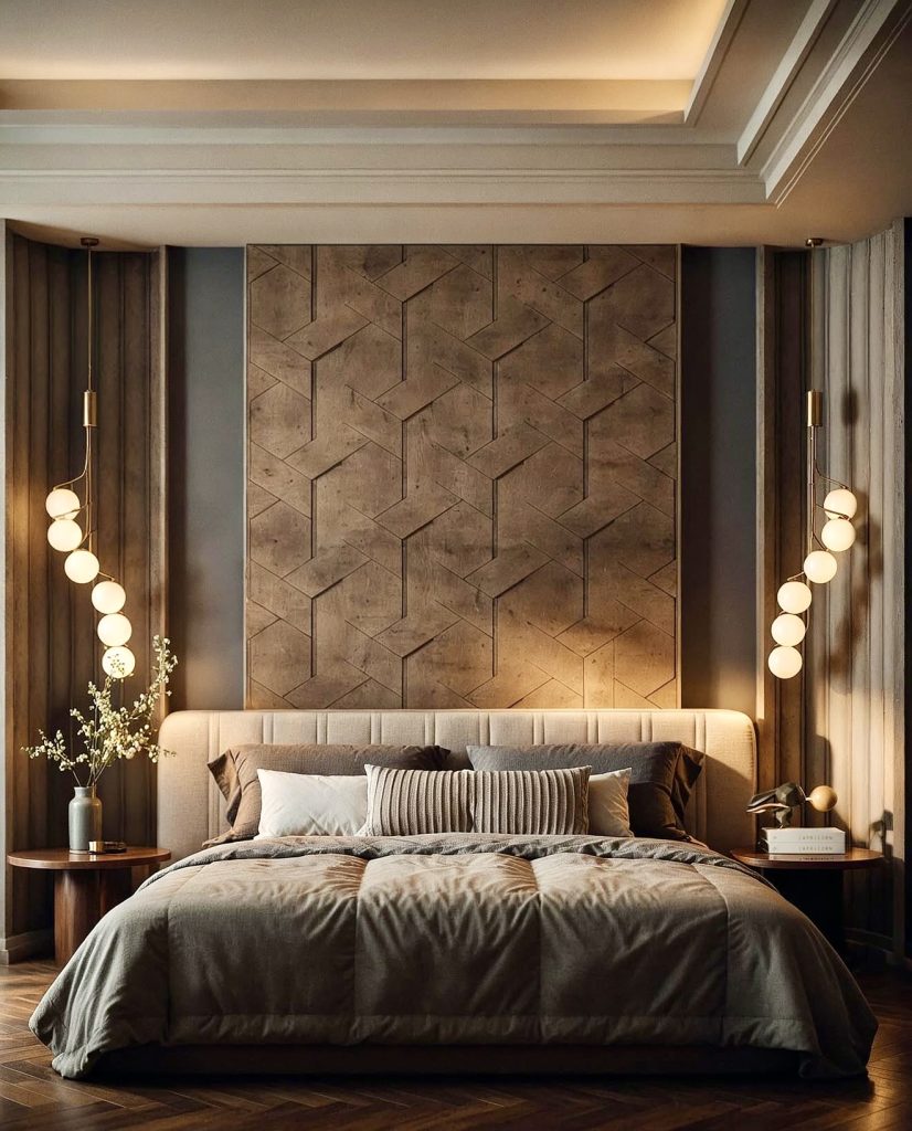 This bedroom is rich, warm, and undeniably moody—a stunning blend of dark wood textures, sculptural lighting, and plush bedding. The geometric wood panel behind the bed adds a dramatic architectural moment often seen in high-end boutique hotels. Pendant lighting with globe-shaped bulbs introduces a touch of mid-century artistry, keeping the design current while tapping into timeless influences. The palette leans earthy and indulgent, perfect for those who want a bedroom that feels like an evening retreat. This look would appeal to fans of rustic luxury and elevated cabin-inspired interiors, yet it remains polished enough to fit seamlessly into a modern urban apartment. It’s one of the most atmospheric examples of interior luxury in the entire collection.