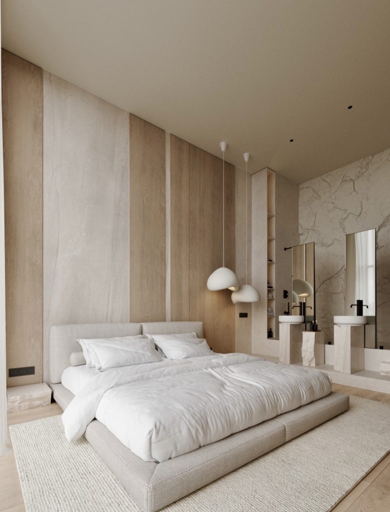This bedroom blends clean minimalism with warm, organic materials, creating a deeply soothing retreat that feels both modern and timeless. The soft, low-profile bed grounds the room, while the vertical paneling behind it introduces a gentle rhythm that design editors often associate with calming, spa-like interiors. The stone elements near the integrated vanity add a quiet sense of luxury—not flashy, just beautifully refined. It’s the kind of room that makes you exhale the moment you step inside, reminding you that a modern bedroom doesn’t have to be complicated to feel indulgent. For homeowners craving a sanctuary within their everyday routine, this look speaks directly to the heart.