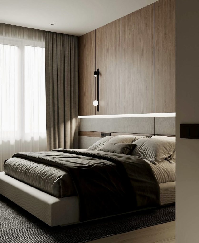 Here, deep wood tones and shadow play create an irresistible moody atmosphere. The bedroom feels intimate and sophisticated, relying on long vertical panels to elongate the space and give it a custom-built feel. A slim, sculptural wall sconce adds the perfect contrast—black against warm wood—showcasing how subtle lighting choices can elevate a minimalist design. The bed’s muted bedding complements the darker palette and gives the room a grounded, almost cocoon-like feel. This style resonates with homeowners interested in sleek, elevated spaces that balance comfort with architectural detail, a trend growing quickly in U.S. interior design this year.