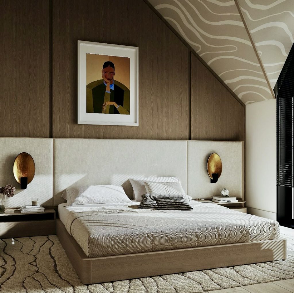 This bedroom carries a sophisticated blend of warm neutrals and expressive artistic details, making it one of the more personality-driven designs in the collection. The bold portrait above the bed adds a touch of retro character, giving the room a lived-in warmth that differs from overly curated spaces. The upholstered extended headboard feels plush and inviting, adding softness to the vertical wood panel backdrop. The room lightly grazes the edges of mid-century influence through the shapes and tones, yet stays firmly planted in 2026’s modern aesthetic—refined, warm, and layered. It’s a perfect choice for design lovers who want a bedroom that feels curated rather than generic.