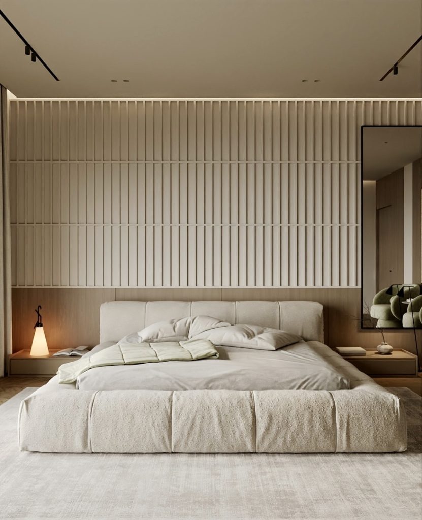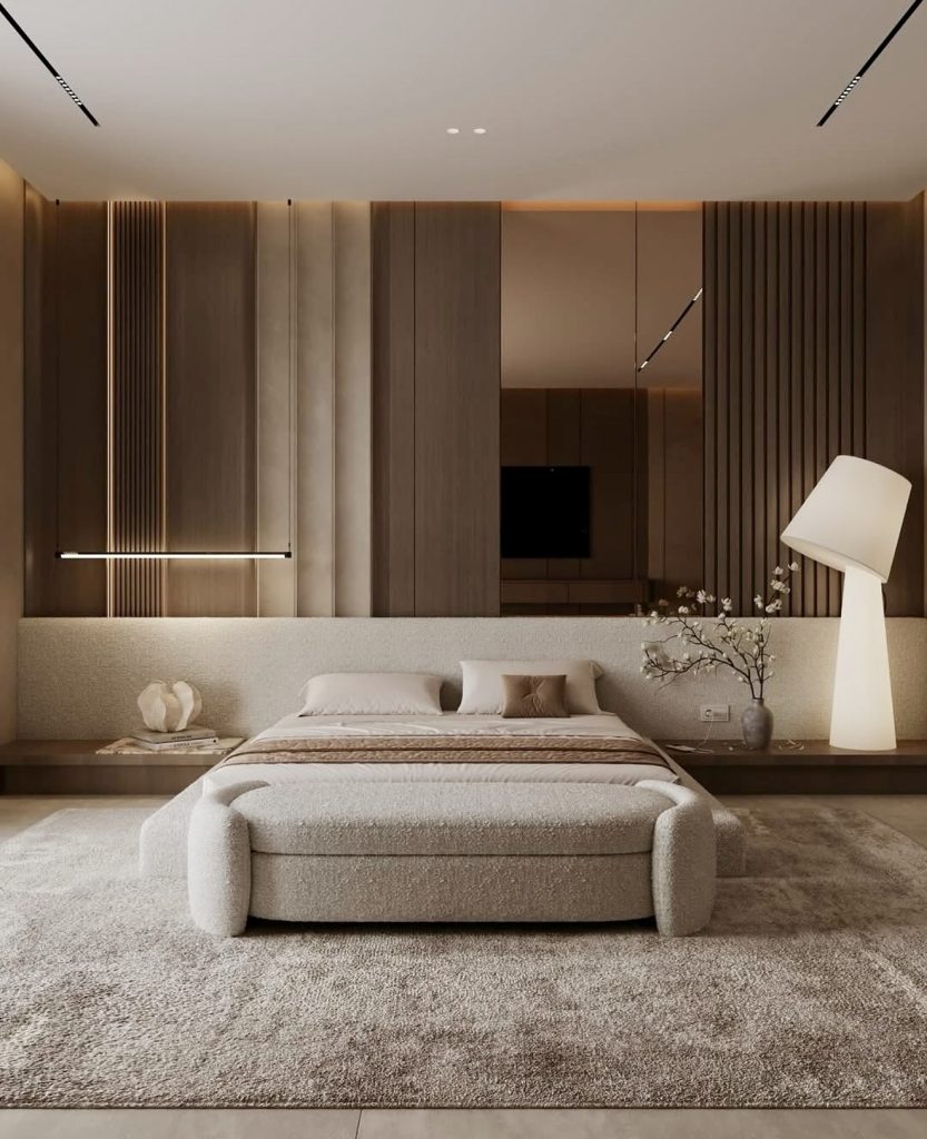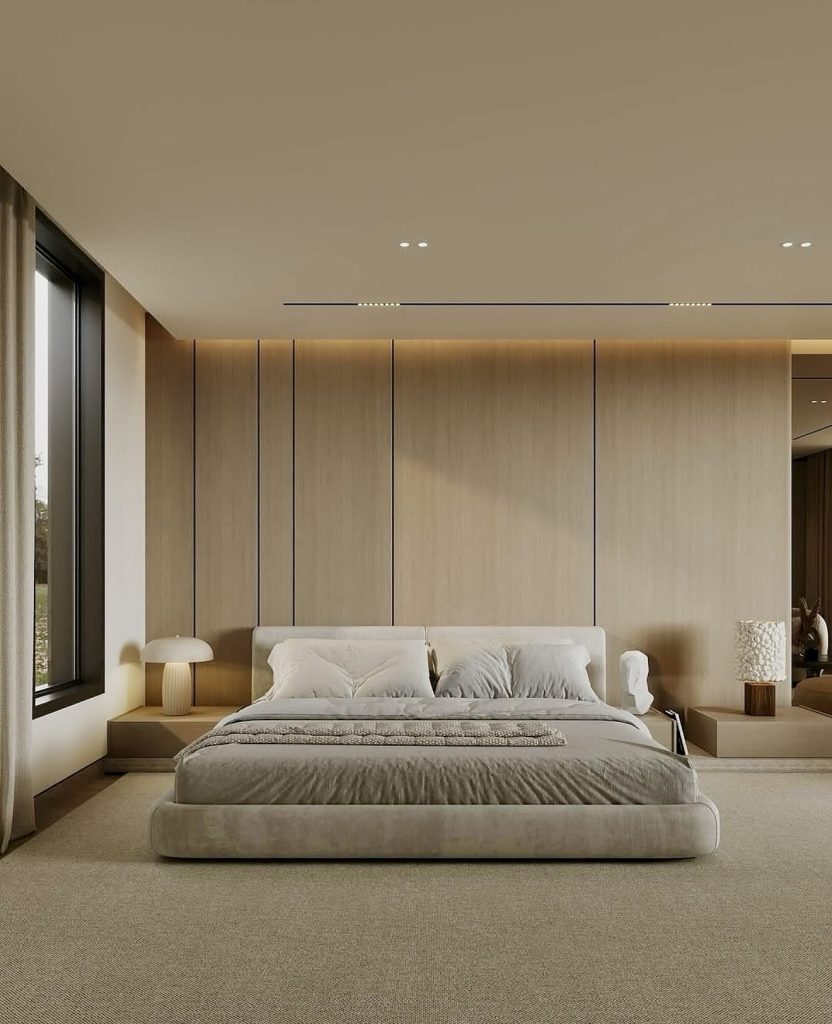 This softly sculpted bedroom is a lesson in earthy modern luxury. The low, plush platform bed practically floats over the muted rug, offering an inviting sense of comfort that appeals to anyone who values a truly cozy bedroom. Vertical paneling adds architectural depth while keeping the aesthetic clean and modern. There’s a quiet, understated luxury here—nothing loud or showy, just thoughtful materials and a serene palette. It also aligns beautifully with the growing trend of tactile minimalism, often highlighted by designers who say the future of interior luxury lies in how a space makes you feel, not how much ornamentation it carries.