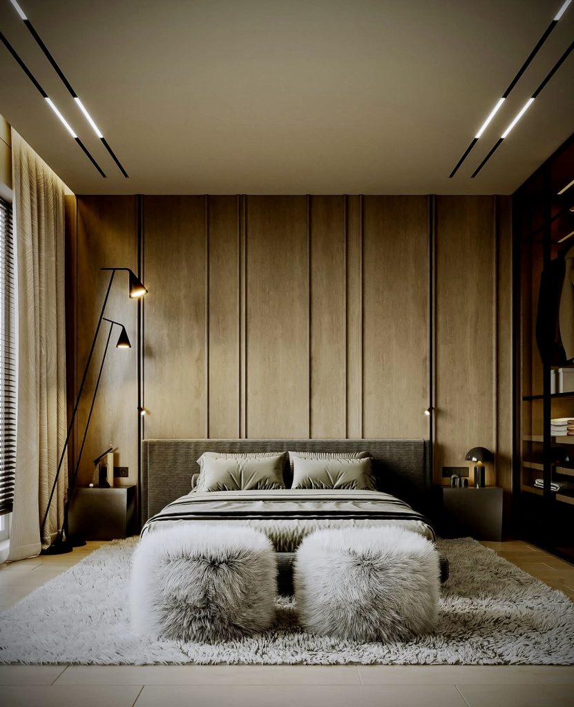 This space combines warm natural wood with dramatic lighting to create a bedroom that feels equal parts inviting and striking. The tall, narrow wall panels emphasize verticality, giving the room a tailored, architectural feel often seen in luxury design spaces. The fluffy ottomans at the foot of the bed add a playful moment of texture—a bold choice that breaks up the structured lines and makes the room feel more cozy and approachable. With its moody lighting, layered neutrals, and modern accents, this bedroom appeals strongly to homeowners who want a comfortable retreat with a refined, boutique-hotel aesthetic. It’s modern but not sterile, luxurious without being overdone.