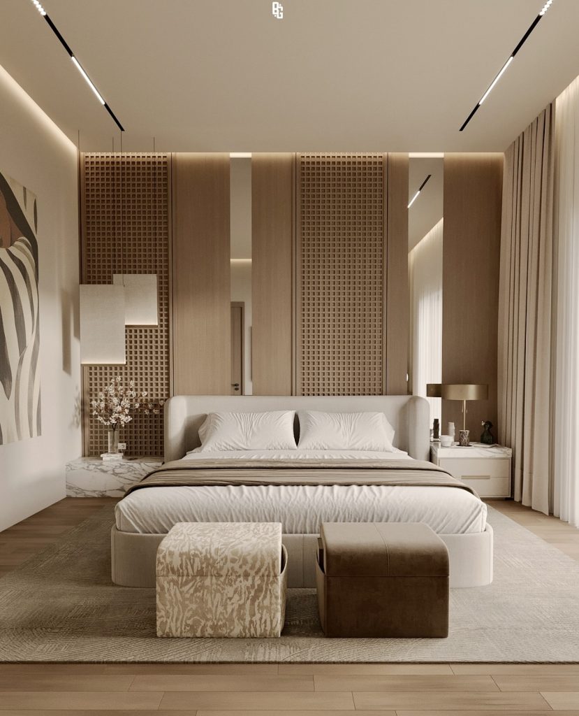 This bedroom is a perfect example of how layered wood can create a rich, earthy atmosphere without overwhelming the senses. The lattice-style panels introduce a subtle pattern that feels both modern and handcrafted, a detail often praised in high-end interior design publications for its ability to add texture without clutter. Soft, sculptural lighting and a neutral palette keep the mood cozy and relaxed. The pair of ottomans at the foot of the bed adds functionality while contributing to the warm, organic aesthetic. This look will appeal to anyone who wants a calm, grounded retreat that still carries notes of quiet sophistication.
