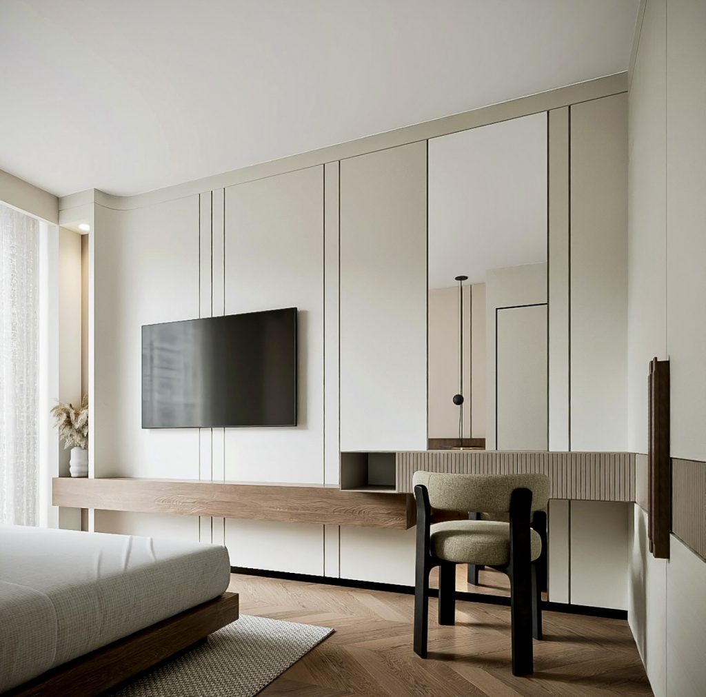 This room shows how a well-designed TV unit design can enhance a bedroom without visually dominating it. The floating wood console, soft white cabinetry, and integrated mirror create a seamless, built-in look that many modern homeowners now seek. Clean vertical lines offer a whisper of mid-century influence, while the overall execution stays firmly rooted in minimalist principles. The muted color palette and soft daylight add a feeling of openness and ease, especially appealing for smaller spaces or apartment living.