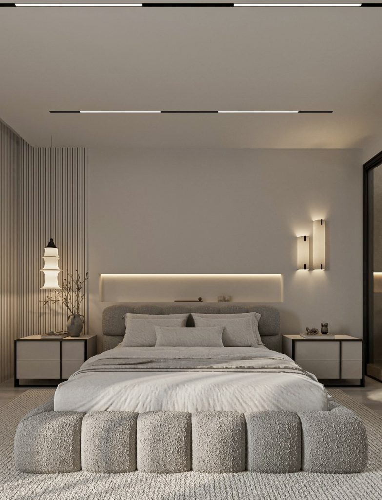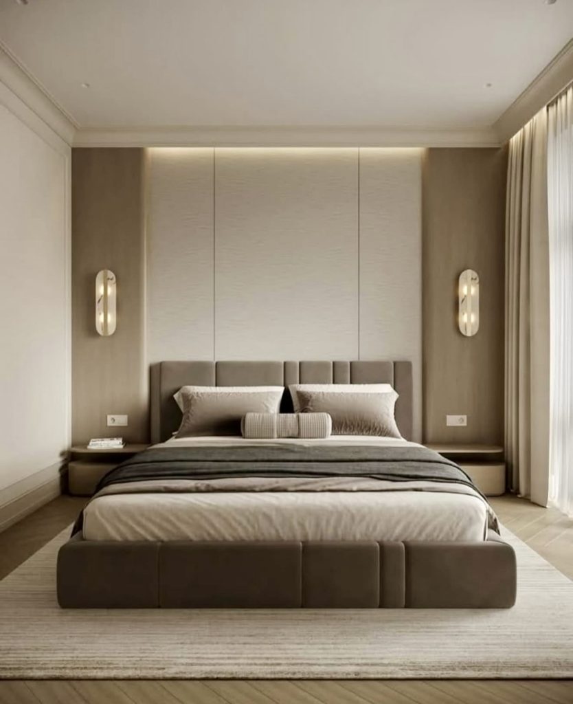 Soft, tonal neutrals set the stage for this soothing modern retreat. The gentle symmetry—two sconces, balanced artwork, equal negative space—creates immediate harmony, something many American homeowners gravitate toward when designing a stress-free bedroom. The upholstered bed adds a touch of design luxury, while the sleek vertical panels echo contemporary European interiors. Despite its quiet palette, the space feels warm and engaging thanks to layered bedding and subtle lighting. It’s a perfect example of modern sophistication without harsh edges, ideal for anyone seeking a restful and cozy sanctuary.