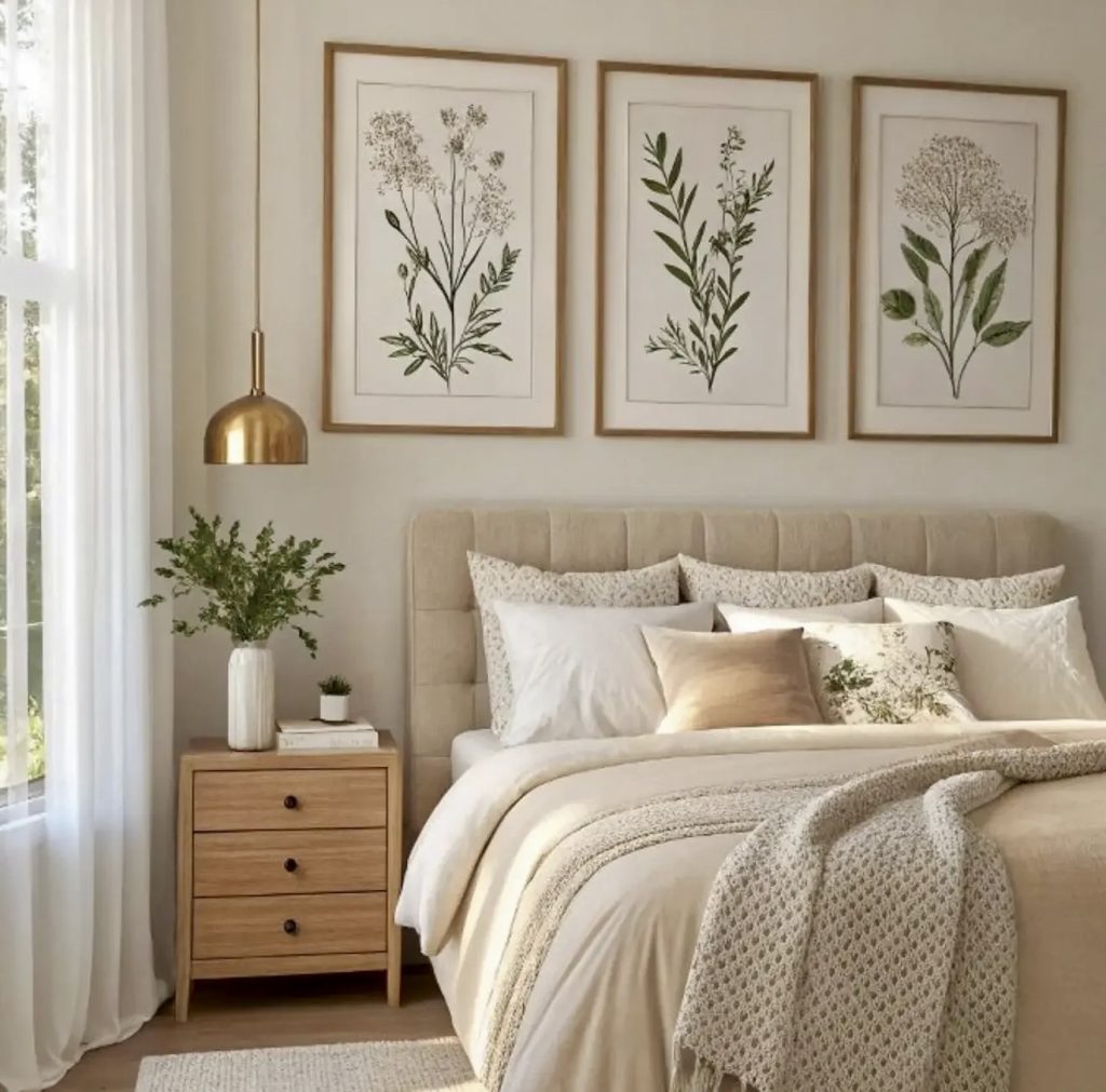This bedroom mixes classic influences with contemporary comfort, creating a welcoming retreat that feels elevated yet livable. The curved upholstered headboard brings a dose of soft luxury, while the botanical artwork adds a subtle vintage charm that’s increasingly popular among homeowners seeking depth without visual chaos. The brass pendant light introduces a refined metallic touch—a detail many luxury design experts highlight as essential to warming up modern neutral spaces. Layered pillows and a textured throw blanket keep the space cozy, making it perfect for anyone who wants a bedroom that looks polished but doesn’t sacrifice comfort. This style resonates strongly with adults between 20 and 60 who appreciate approachable design that still feels thoughtful and intentional.