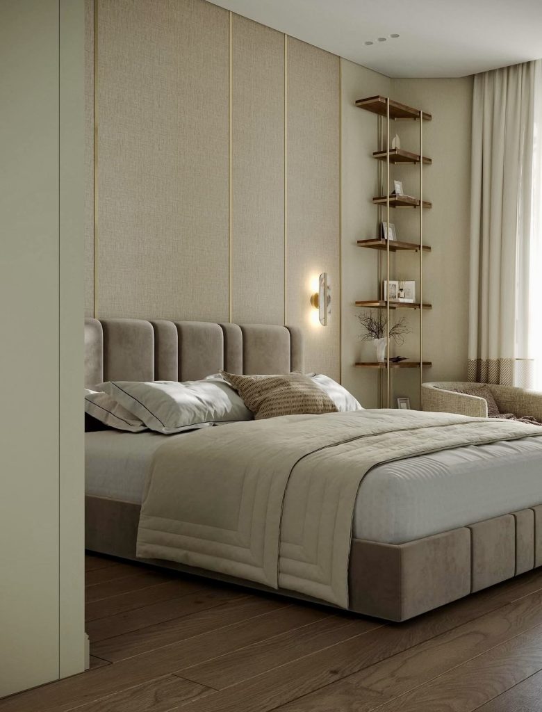 This room highlights how minimalist design can still feel rich and expressive when texture and lighting are handled thoughtfully. The tall vertical panels bring a sense of height, while the gold-accented wall sconce adds a streamlined hint of classic elegance. The fabric-covered headboard and soft bedding reinforce a sense of comfort central to modern bedroom design in 2026. The open shelving adds personality without detracting from the calm, unified palette. This aesthetic works beautifully for anyone wanting a refined space that blends warmth, organic softness, and subtle architectural detailing.