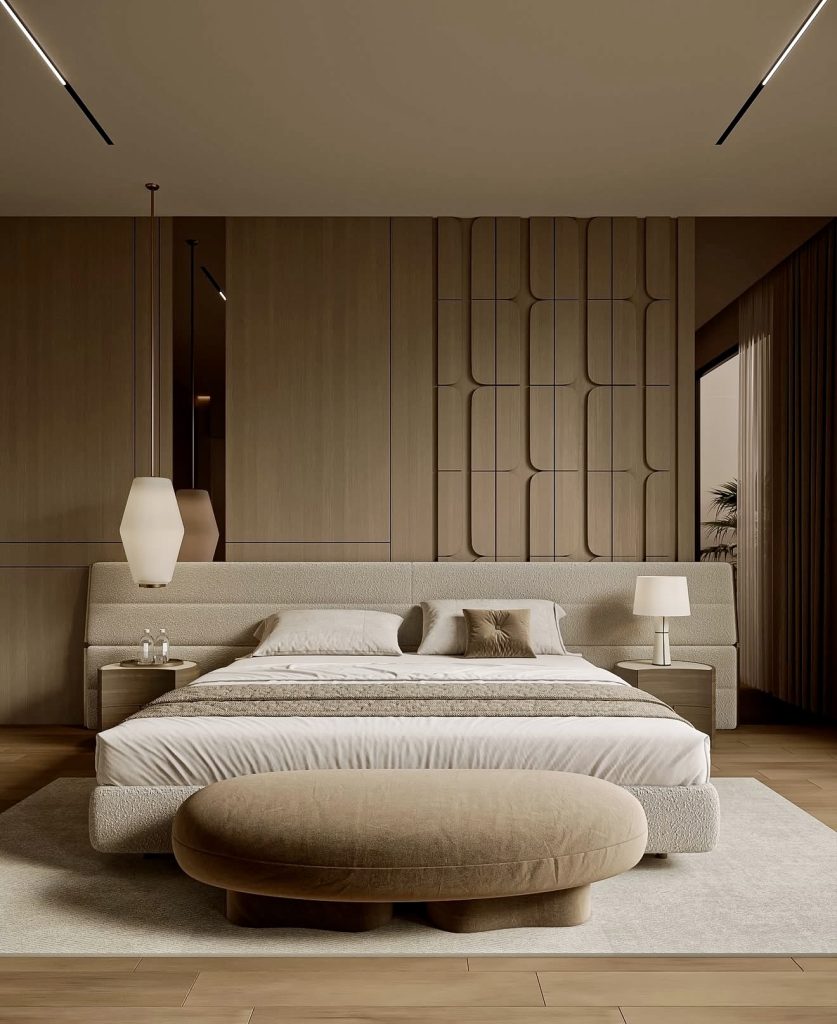 This bedroom is a beautiful example of organic modern design—calm, sculptural, and refined. The softly rounded ottoman and upholstered bed bring a tactile warmth that feels inviting without sacrificing sophistication. Vertical wood paneling, paired with curved geometric detailing, adds depth and rhythm, a technique often praised by luxury designers for elevating simple materials. The pendant lights introduce a contemporary sculptural element, giving the room a subtle, luxurious design appeal. Everything here reads serene and effortless, perfect for those wanting a restful retreat grounded in natural textures and soft forms.