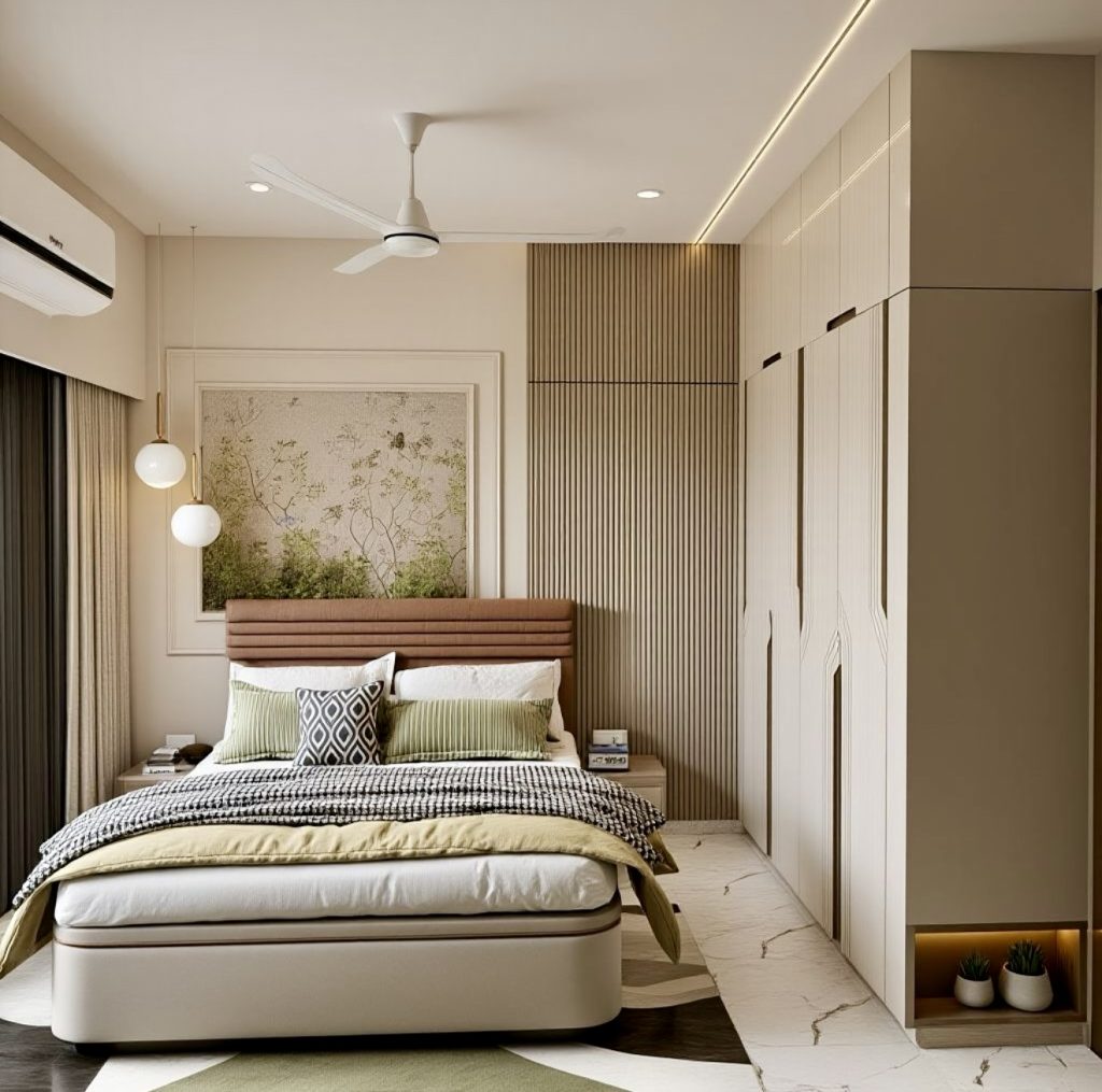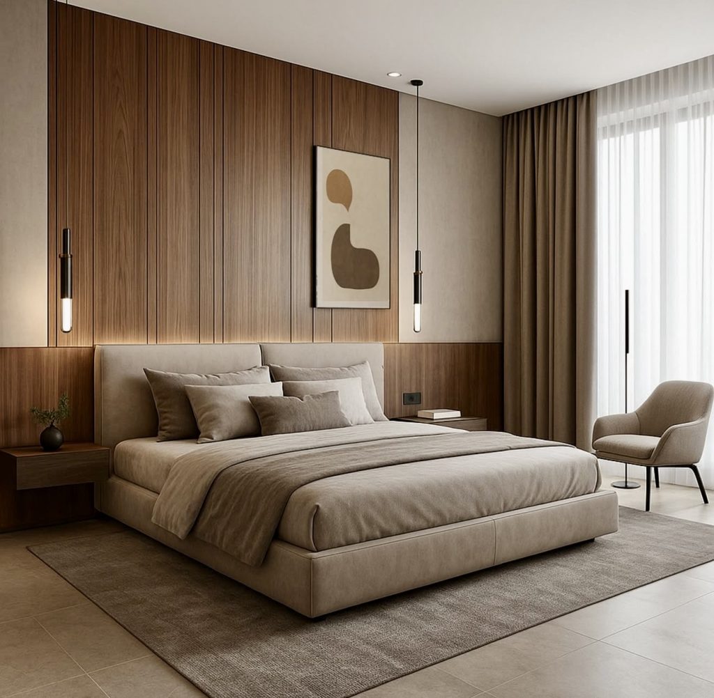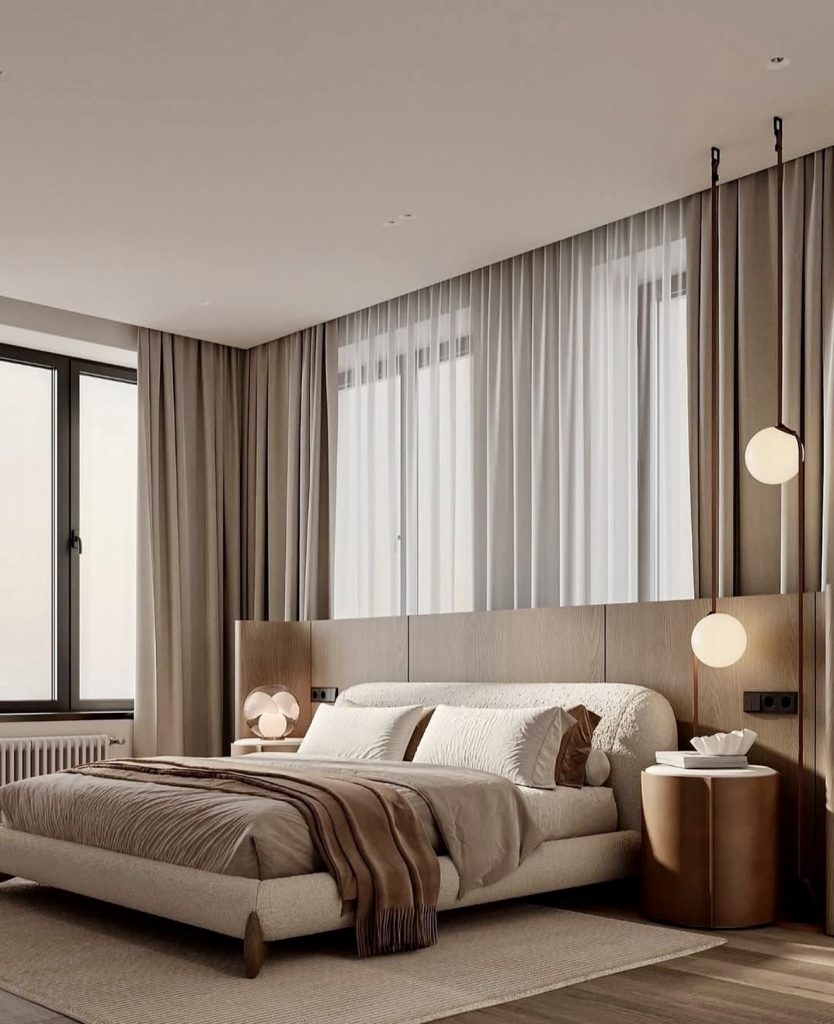 This bedroom blends modern coziness with a soft, earthy palette of warm neutrals. The rounded bed frame and textured throws add tactile richness, while the pendant lights introduce sculptural movement that feels modern yet serene. The vertical wood panels behind the bed create inviting depth, while the layered drapery filters natural light into a gentle glow. This design strikes a perfect balance between refined style and effortless comfort, ideal for anyone who loves contemporary interiors that still feel warm and livable.