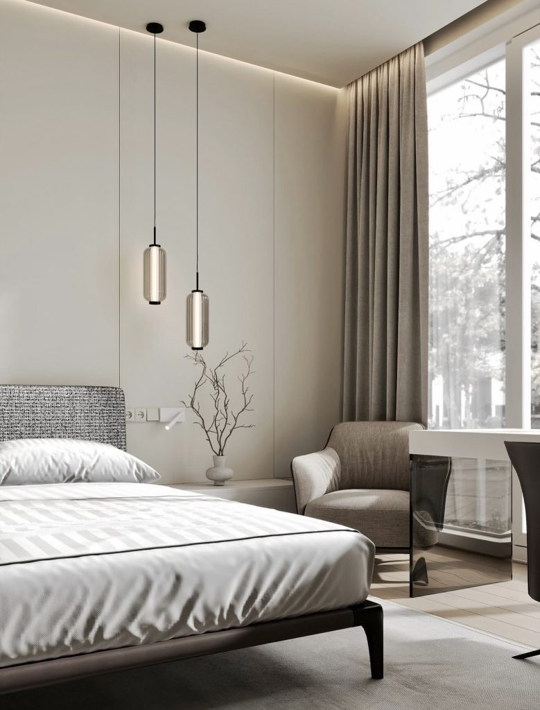 This bedroom celebrates true minimalist calm through clean architecture, soft color transitions, and refined lighting. The elongated pendant lights add a vertical elegance, giving the room a modern, gallery-like feel. A textured headboard introduces a subtle tactile element, while the armchair and transparent glass side table create an airy composition without visual noise. Floor-to-ceiling curtains enhance softness and comfort, perfectly balancing the room’s structured geometry. This design works beautifully for those seeking a quiet, sophisticated space rooted in light, balance, and simplicity.