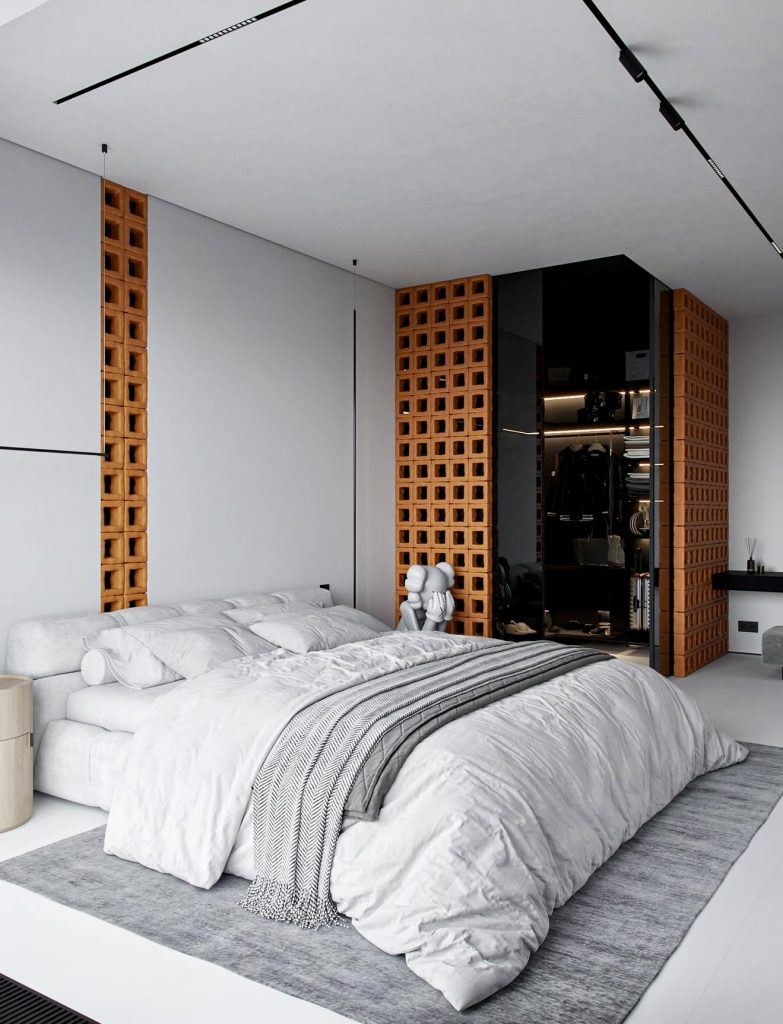 This striking interior blends industrial character with plush comfort. The standout feature is the warm terracotta lattice panels, acting as both a sculptural divider and a visual focal point. They contrast beautifully with the crisp white walls and bedding, while the glossy black wardrobe further amplifies the modern aesthetic. Soft, oversized bedding creates a luxurious, cloud-like sleeping area, making the space feel inviting despite its bold architectural choices. This room is perfect for those who embrace urban style while still wanting softness and personality.