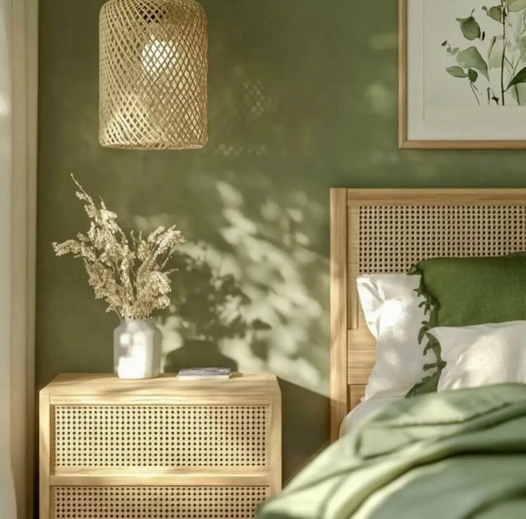 A playful blend of mid-century and contemporary style, this bedroom leans into fresh green tones that feel grounding and serene. Cane furniture introduces a natural texture that aligns perfectly with today’s love of organic materials, while the soft shadows cast across the green wall add dimension that design enthusiasts adore. It’s an excellent example of how midcentury silhouettes can feel new again when paired with today’s trending hues. This look is ideal for those who want a relaxing yet expressive bedroom—something that feels calm but not colorless. Designers at Domino and House Beautiful have often noted that green evokes a sense of renewal, which makes it a natural choice for a 2026 bedroom refresh.