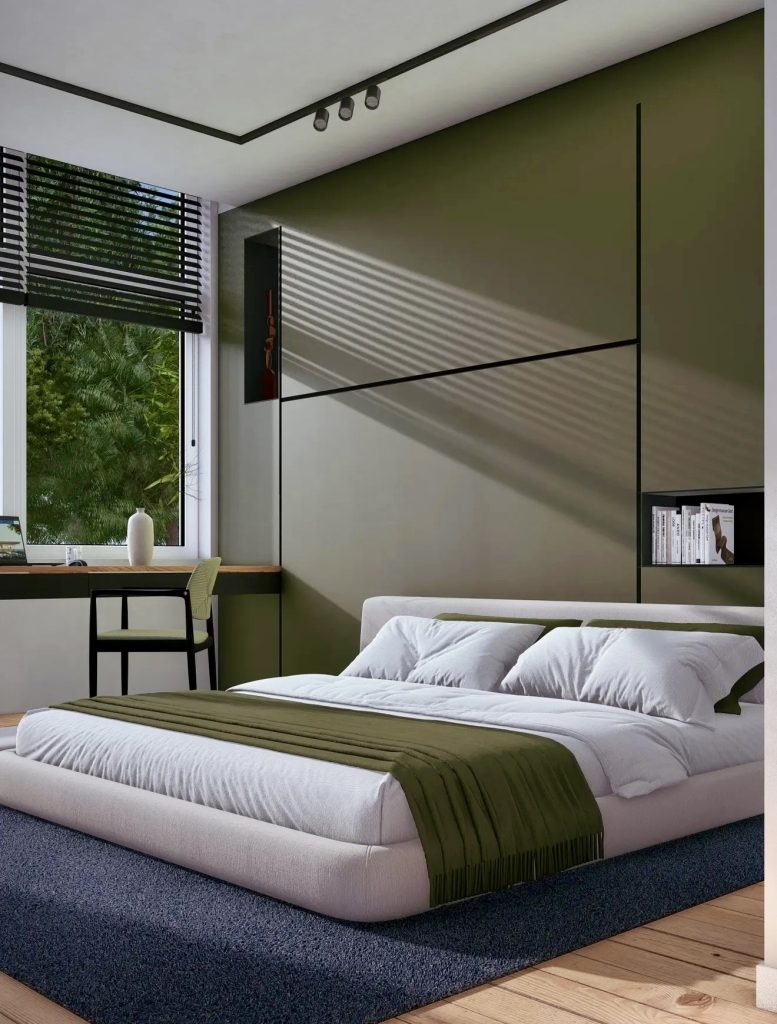 30. Earthy Green Accent Bedroom With Minimalist Lines