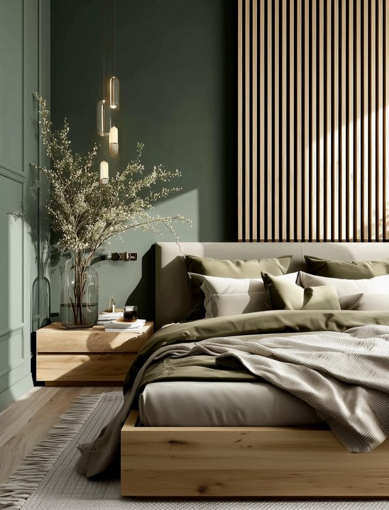 Here we see a dramatic shift into a moody palette—deep greens, layered neutrals, and warm wood grains—all combining to create a master luxury bedroom design worthy of an upscale hotel. Vertical slatted panels behind the bed add architectural interest and subtle movement, while modern pendant lights draw the eye upward, offering subtle inspiration for ceiling design ideas. The aesthetic blends earthy calm with high-end finishes, a combination popular among homeowners who want their bedroom to feel luxurious without veering into excess. With its grounded colors and lush bedding, this look is both visually striking and irresistibly cozy, reminding us that interior luxury is as much about comfort as style.