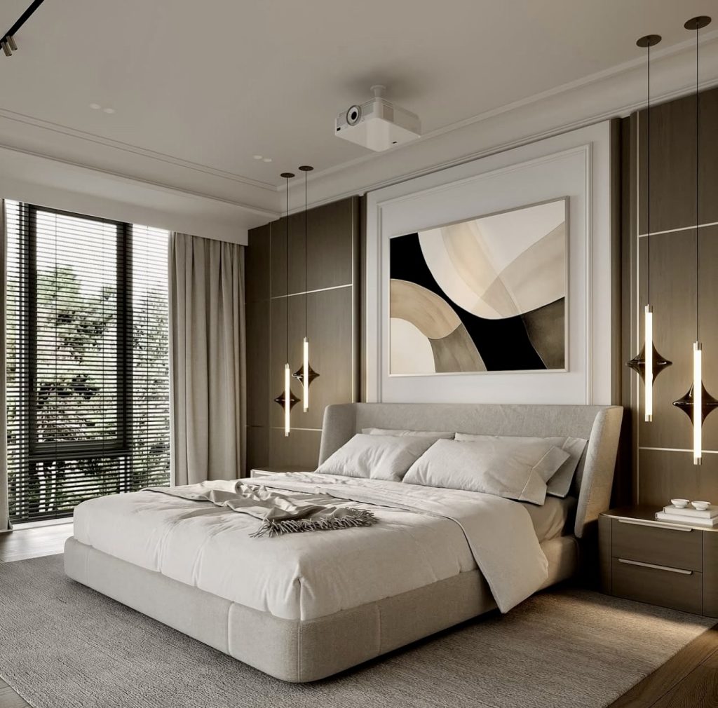This bedroom leans into elevated hotel-suite sophistication, pairing soft neutrals with sculptural pendant lights that instantly set a luxurious design tone. The upholstered bed feels intentionally low and grounded, a detail many luxury interior designers emphasize for creating a serene sleeping environment. The abstract art above the headboard adds a subtle mid-century flavor without overwhelming the palette, while the wood-paneled walls contribute warmth and balance. Homeowners searching for chic, approachable ideas often gravitate toward this blend of neutral comfort and architectural lighting. It’s a great reminder that you don’t need bold colors to make a modern space memorable—texture, form, and lighting can be just as dramatic.