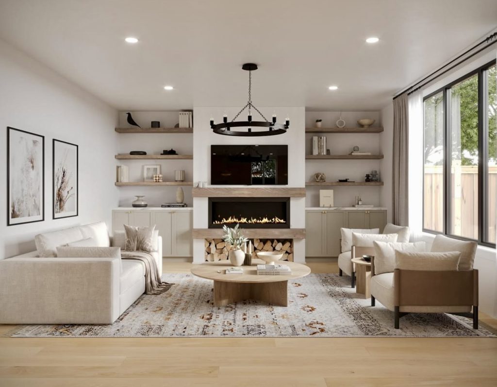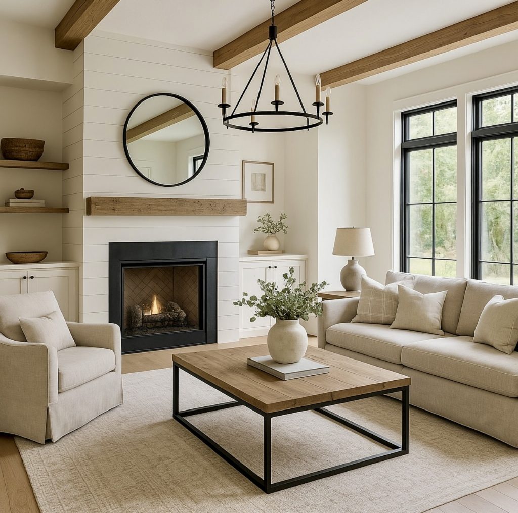 This design highlights the perfect balance of modern simplicity and rustic warmth. The streamlined layout features a soft white sofa, paired with neutral armchairs and anchored by a patterned rug. The sleek fireplace with neatly stacked wood becomes the heart of the room, while open shelving offers inspiration for wall decor that’s both stylish and personal. A circular wooden coffee table adds an organic touch, making this space feel cozy yet sophisticated. It’s a look that works in both large homes and small spaces, proving modern farmhouse style adapts to many lifestyles.