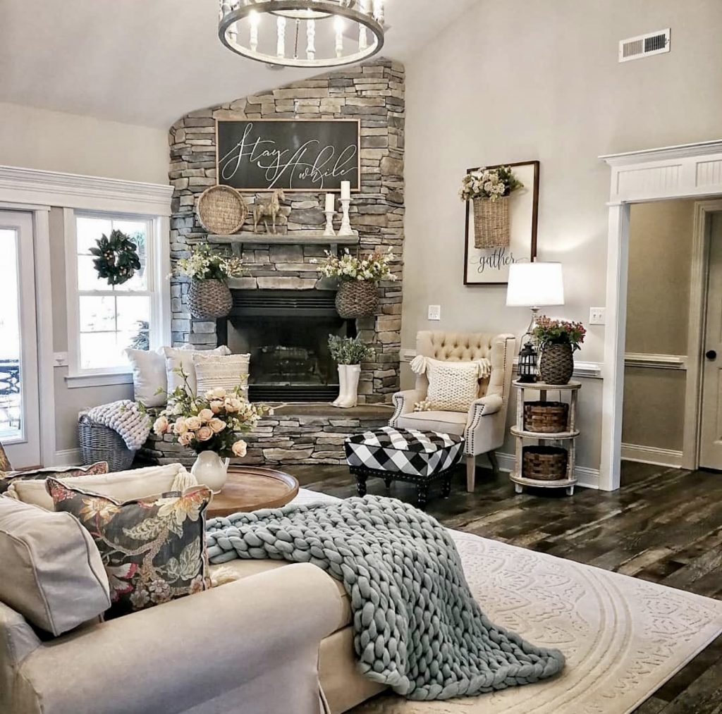 10. Stone Fireplace with Traditional Farmhouse Charm