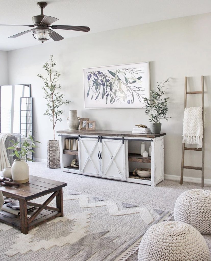 This living room captures the effortless charm of modern farmhouse living room 2026 with its balance of rustic wood and fresh greenery. The distressed barn-style console instantly sets a rustic tone, while the botanical artwork above provides elegant wall decor that feels timeless. Knitted poufs and a patterned rug add warmth and tactility, while touches of greenery bring an organic freshness to the space. The layout is uncluttered, making it ideal for a small space or even a chic apartment. It’s a look that encourages layering of textures without losing simplicity.