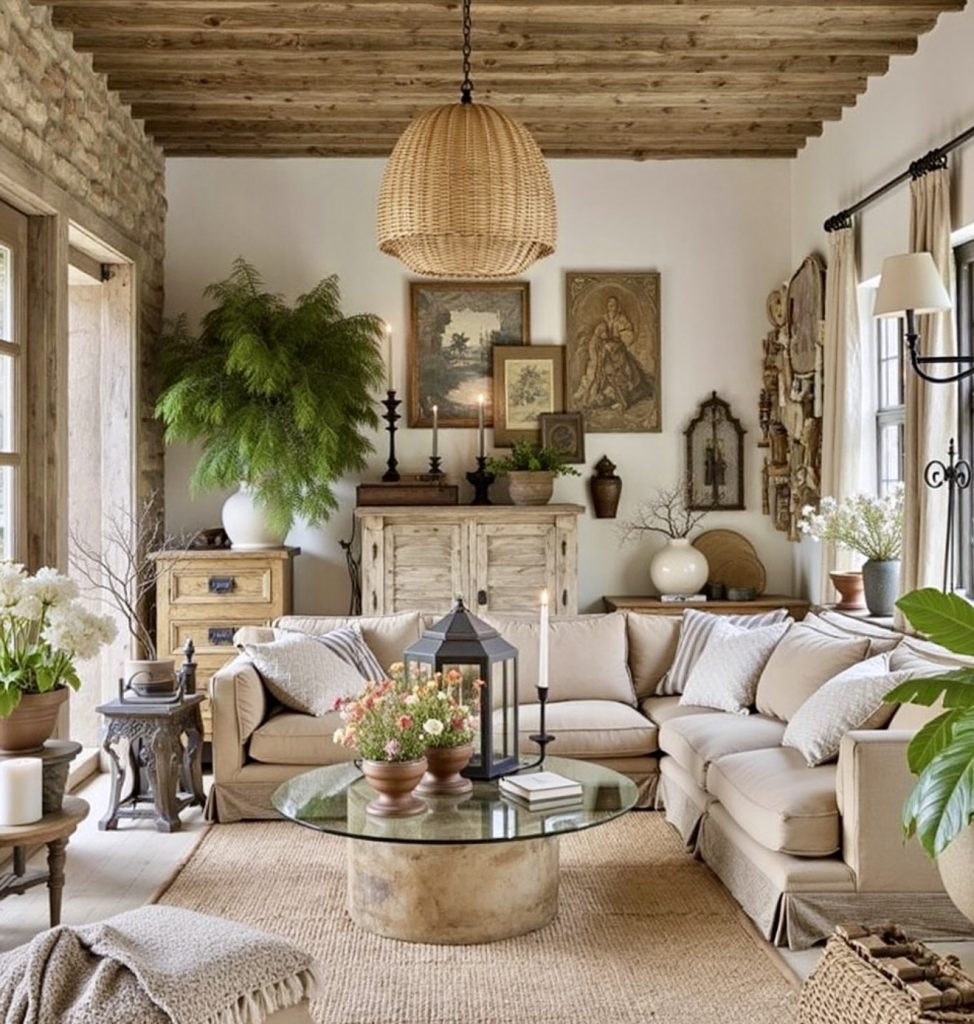 This design feels like stepping into a European countryside retreat—perfect inspiration for anyone seeking decor ideas with character. A mix of vintage furniture, aged artwork, and woven textures bring depth and authenticity, while the sectional sofa ensures the room stays cozy and functional. The ceiling beams and rustic stone walls lean heavily into rustic design, while layered textiles and greenery give the room a soft boho edge. The moody yet welcoming palette combines earthy tones with natural fibers, reminding us that farmhouse style is as much about personality as it is about comfort.