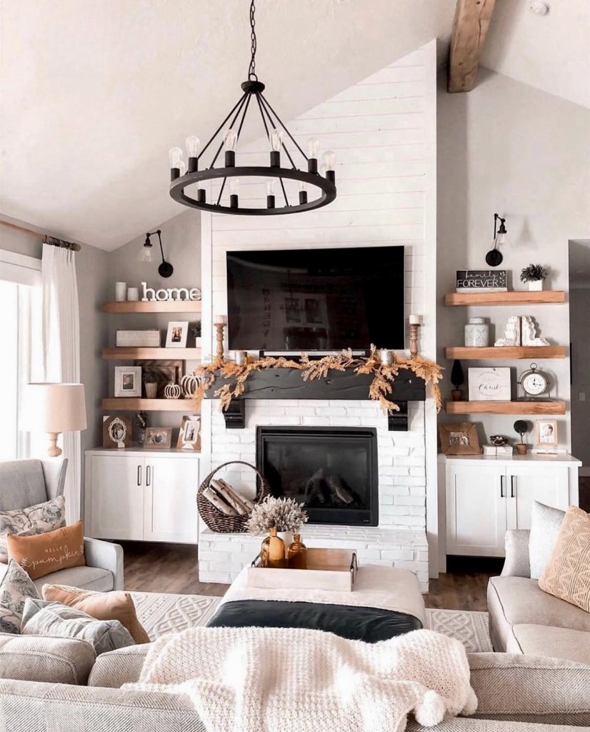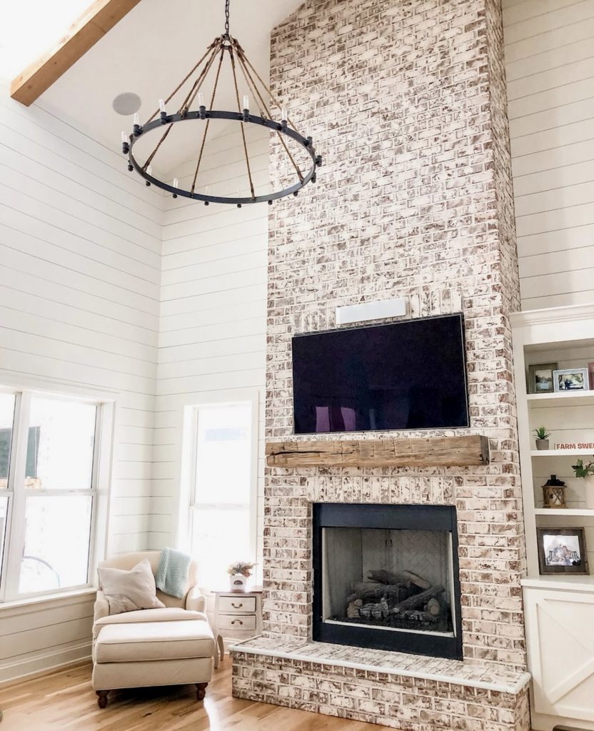 The tall brick fireplace instantly commands attention, proving that a strong architectural feature can define the entire layout of a room. The whitewashed finish balances dark accents with soft colors, bringing a fresh take on classic rustic farmhouse design. Above the mantel, the tv wall integrates seamlessly into the vertical structure, while built-in shelving offers endless decor ideas. Paired with a cushioned chair and a plush throw, this design captures both form and function. The soaring height and chandelier ensure the room feels both airy and dramatic, showing that farmhouse style can scale beautifully to larger spaces.