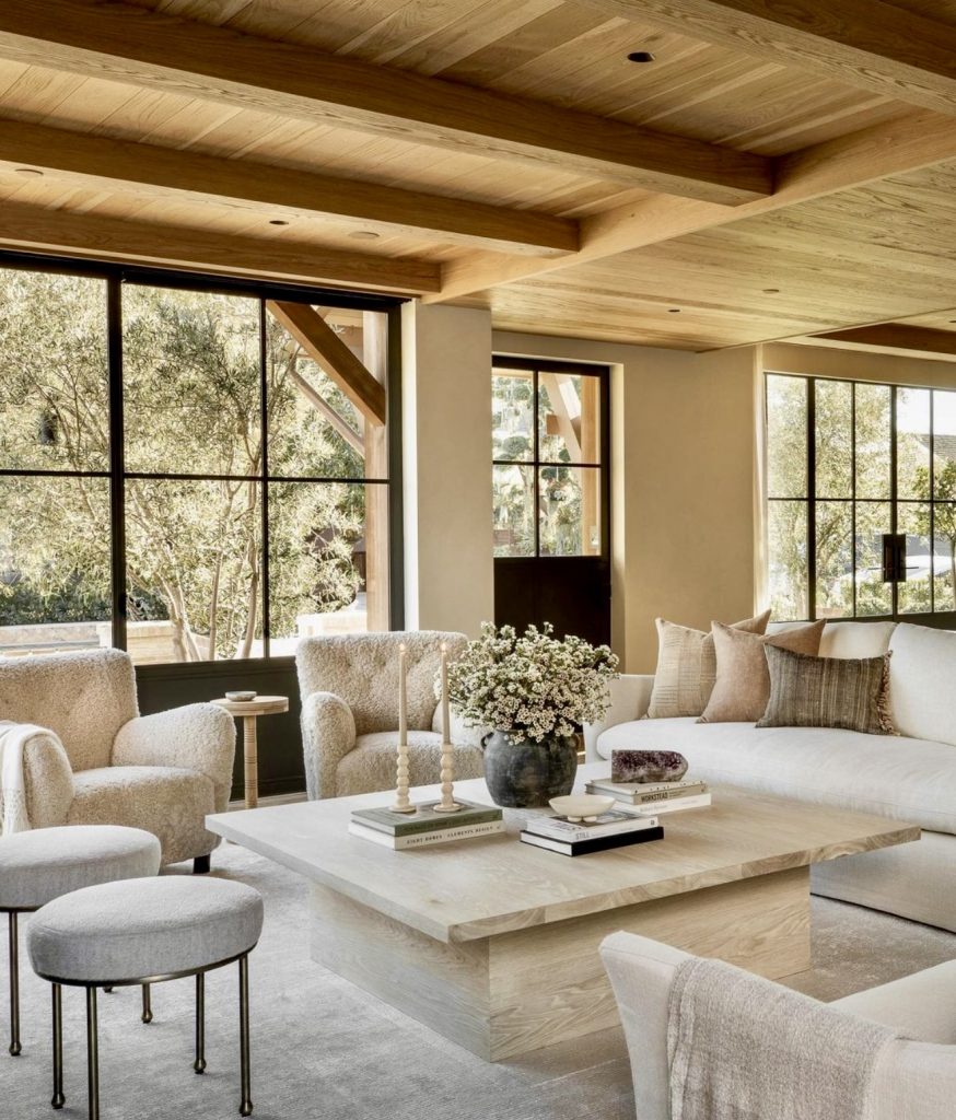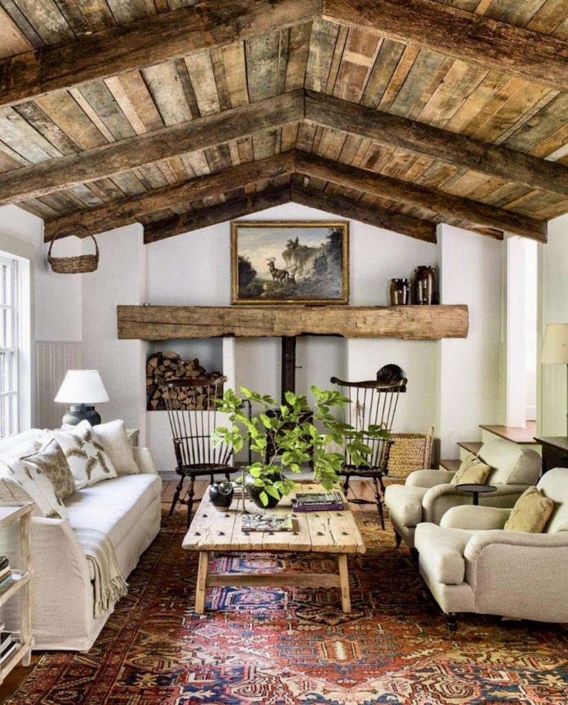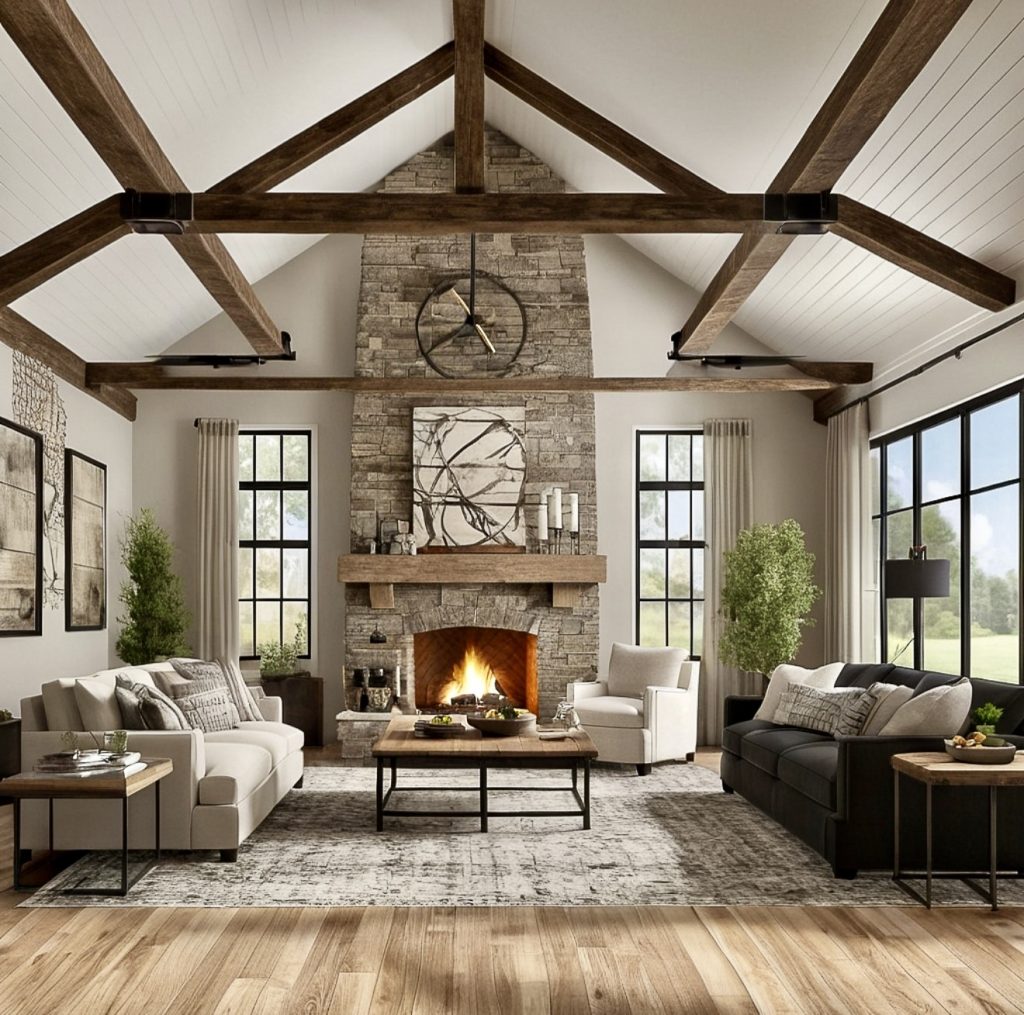 This room leans fully into rustic farmhouse character, with reclaimed wood beams overhead setting the stage for a truly unique atmosphere. The vintage coffee table and patterned rug give the room an organic and collected-over-time appeal, while greenery on the table adds freshness. The simple layout with a white sofa and two armchairs creates balance, making the room both cozy and conversational. This design is a reminder that farmhouse style is about honoring history while making it livable for today.