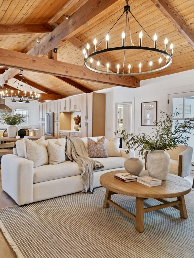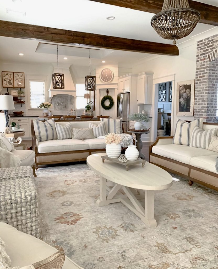 This living room blends seamlessly with the kitchen, highlighting the open-concept layout that so many homeowners love today. Wood beams add a rustic frame overhead, while striped pillows on cream sofas provide a subtle nod to Joanna Gaines–inspired design. The pale patterned rug softens the space, balancing the crisp white walls and cabinetry in the background. Accessories like ceramic vases and fresh greenery bring in an organic touch, creating inspiration for everyday decor ideas that feel approachable and timeless.