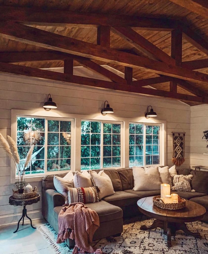 Here, farmhouse living takes on a moody and intimate vibe. The exposed wood beams and shiplap walls create a cozy setting, while the brown couch piled with throw pillows makes the space ideal for relaxed evenings. Candles on the round coffee table add a soft glow, reinforcing the inspiration of creating atmosphere with simple decor. The patterned rug grounds the room and brings extra texture, ensuring that the style feels layered but not cluttered. It’s a reminder that farmhouse design works just as beautifully in an intimate den as it does in expansive spaces.