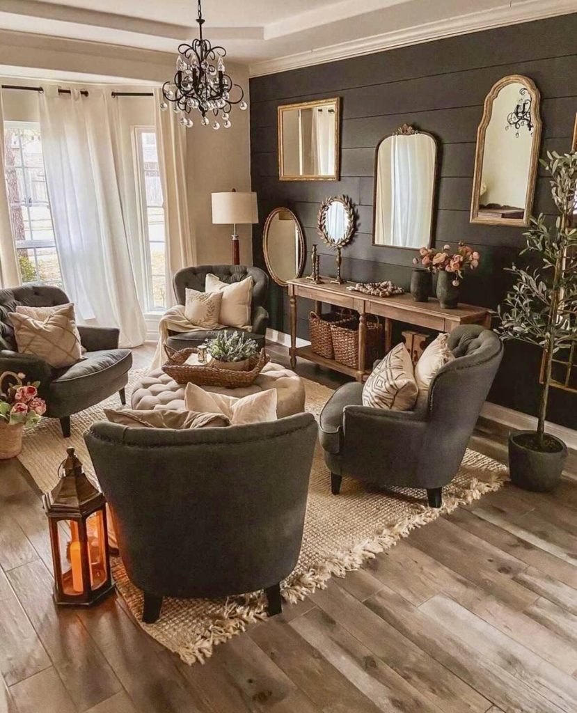 This room proves that farmhouse style isn’t limited to neutrals. The black shiplap accent wall creates depth and contrast, while a collection of vintage mirrors delivers unique wall decor. Plush armchairs and a tufted ottoman make the space feel both formal and cozy, while lantern lighting adds a soft, rustic glow. Paired with curtains that let in plenty of light, the room strikes a perfect balance between dark drama and approachable farmhouse warmth. It’s a clever example of how decor ideas can make a small room feel both stylish and inviting.
