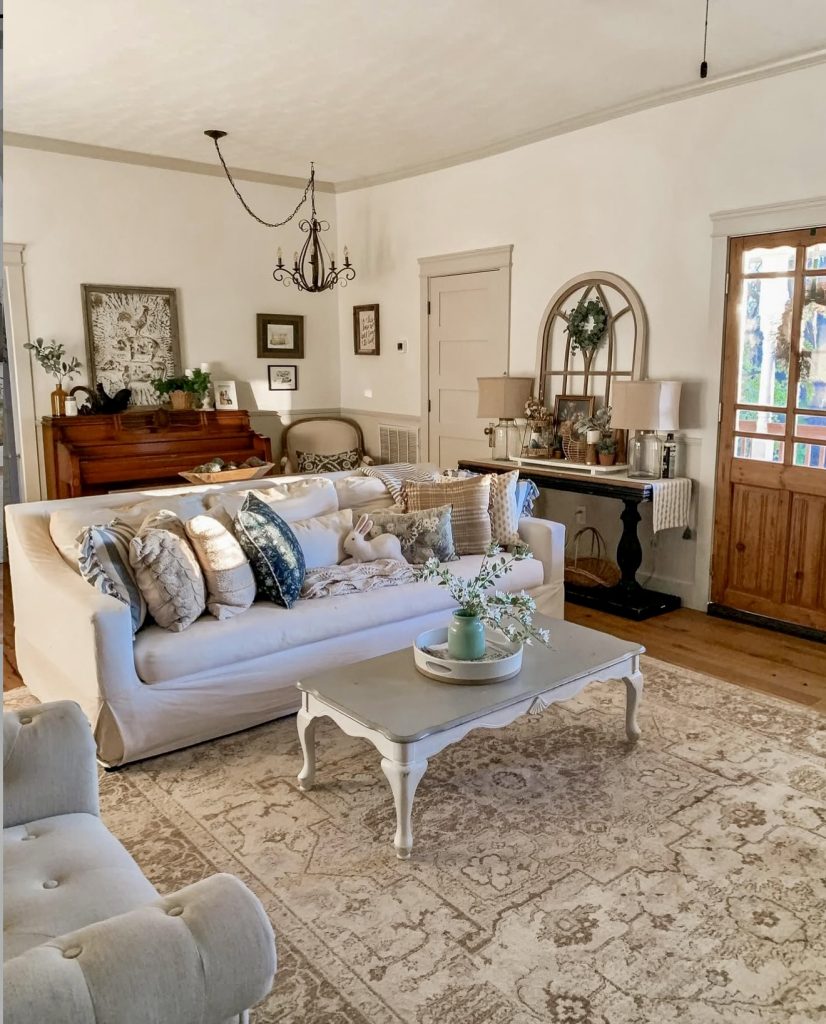 This living room captures the timeless side of farmhouse design with its soft white sofa, patterned rug, and curated antique touches. The piano adds character, reminding us that furniture can also tell a story, while the wooden door brings in rustic authenticity. The layered pillows in muted colors provide comfort and charm, making the room cozy while still polished. The overall layout is practical yet stylish, offering inspiration for anyone decorating a historic home or adding farmhouse touches to a newer build.