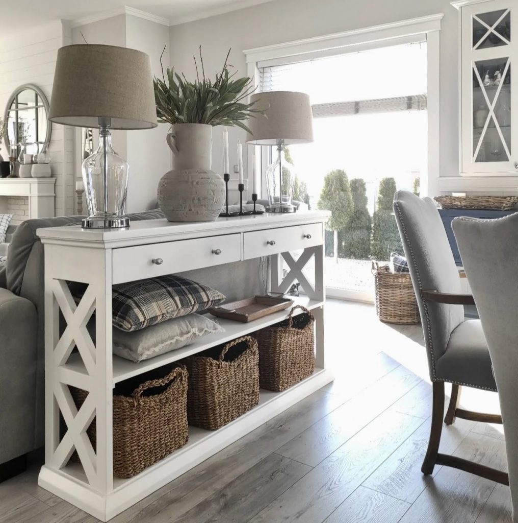 This setup is all about farmhouse practicality meeting charm. The console table behind the sofa becomes a hero piece, offering both display and hidden storage with woven baskets and decor ideas like pillows and blankets neatly arranged. Layered lamps and a ceramic vase bring height and boho textures, while the mix of woven and wooden accents feels authentic and rustic. The muted paint color palette softens the entire scene, reminding us that farmhouse design doesn’t have to feel heavy—it can be light, airy, and practical for everyday living, whether in a family home or a stylish apartment.