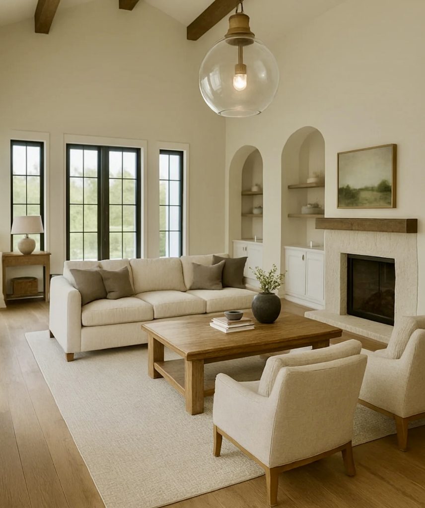 This space combines the modern farmhouse living room 2026 essence of the clean layout, the neutral color scheme, and the touch of subtle organic elements. Light-colored walls alongside natural wood furniture give the space a warm but clean atmosphere. The fireplace gives the area form while the arch-shaped built-ins give the idea of personalized decoration ideas without overwhelming the space. Textured area rugs and soft beige furniture round out the space, making the area both inviting and elegant.