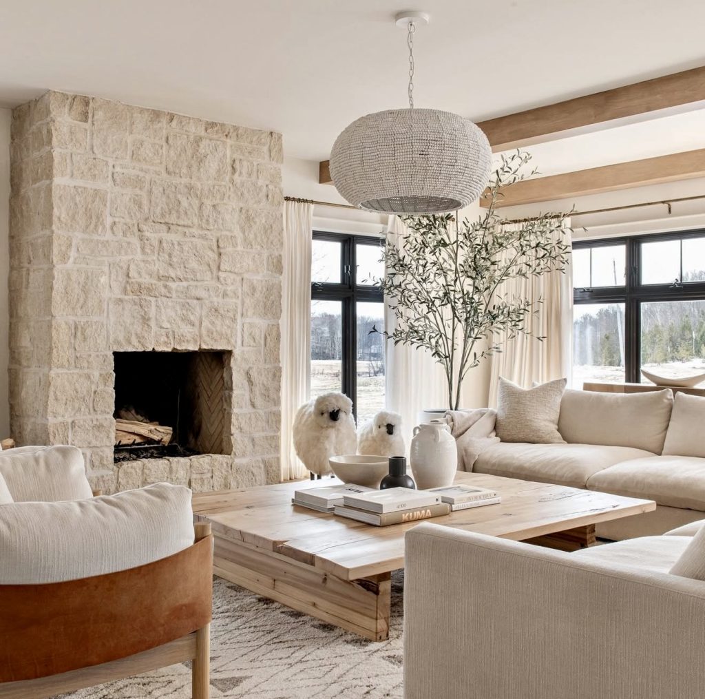 Here, a pale stone fireplace becomes the anchor, contrasting beautifully with oversized white sofas and natural textures. The addition of playful accents—like sculptural sheep decor—adds charm while still feeling elevated. A wooden coffee table grounds the room, while curtains soften the large windows. With layered furniture, gentle tones, and fresh greenery, this space offers pure inspiration for those who want farmhouse living to feel airy, approachable, and full of character.