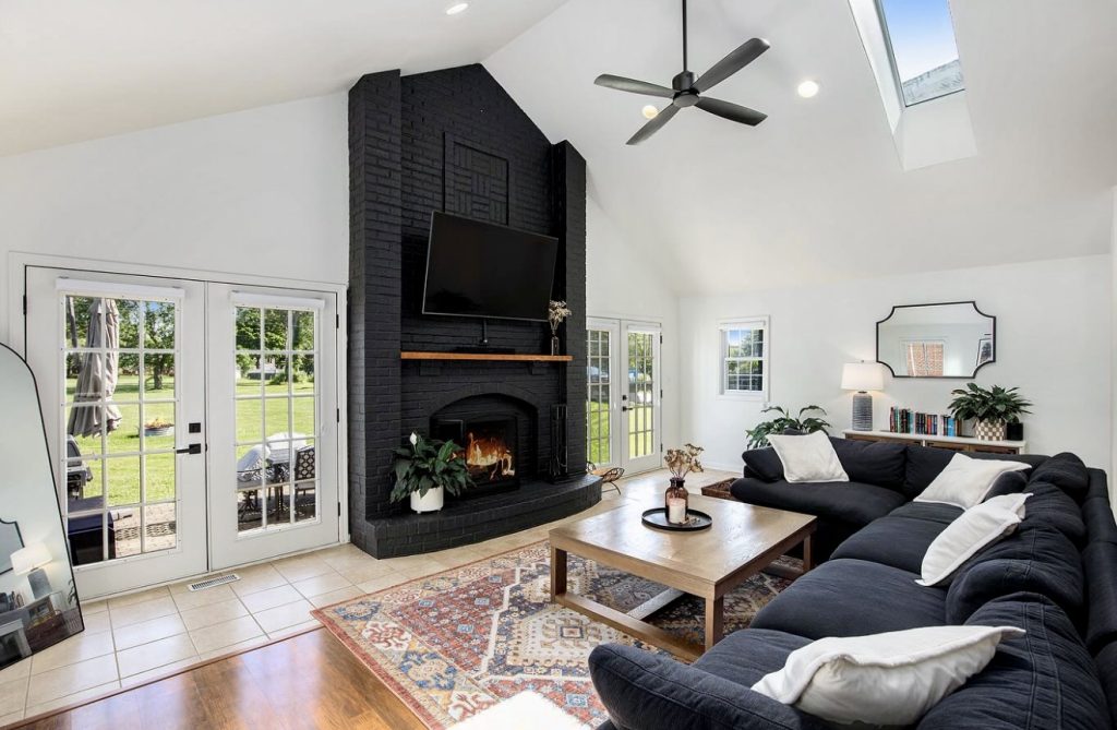 29. Bold Contrast with a Black Fireplace