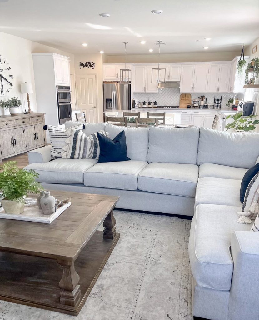 Few things feel as inviting as a sectional sofa paired with a spacious farmhouse kitchen. This grey couch is large enough for family movie nights yet styled with striped pillows for a cozy layered effect. A sturdy wooden coffee table grounds the space, showing how furniture can balance farmhouse charm with practical durability. The open layout seamlessly connects the living area with the kitchen, a nod to modern American living where spaces blend together. The light colors and farmhouse accents inspire both decor ideas and functionality—perfect for entertaining or everyday comfort.