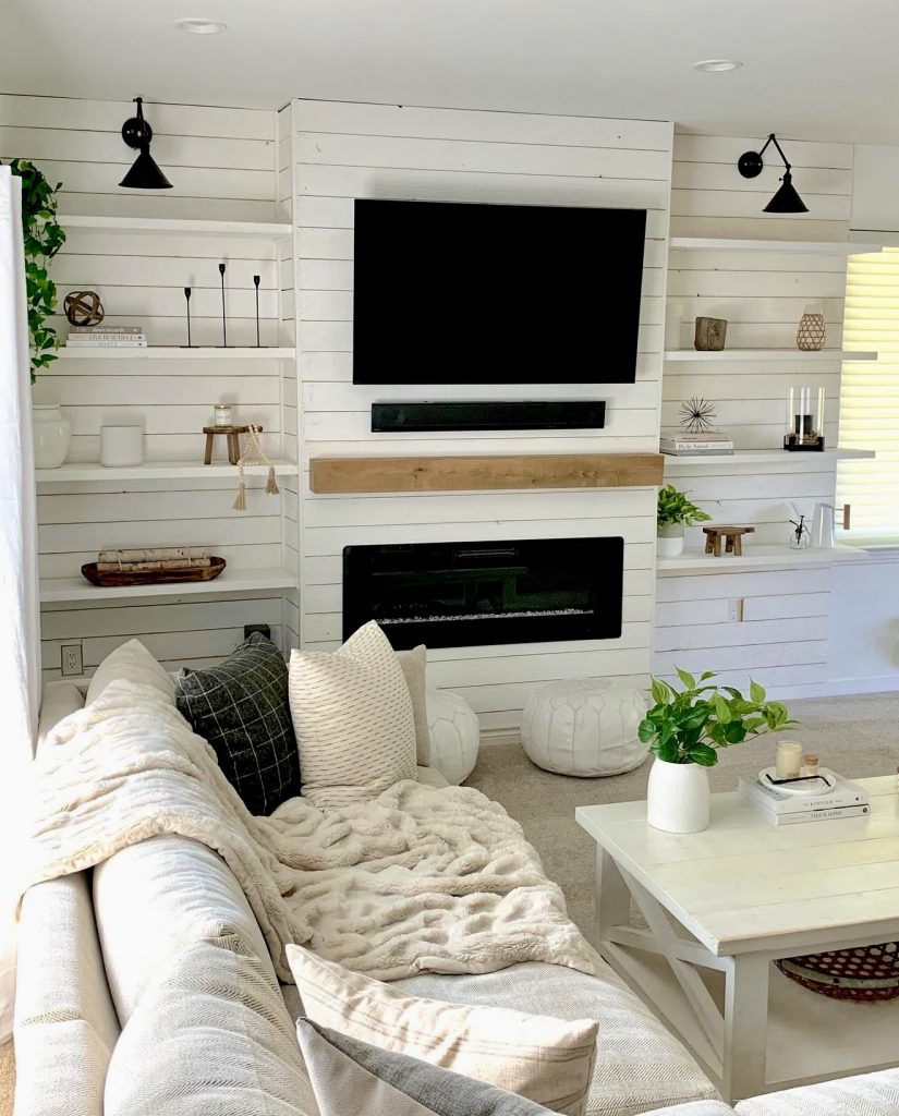 This living room embodies the cozy side of farmhouse living. A large sectional wrapped in plush blankets invites you to sink in, while the tv wall above the fireplace provides a central focus for family life. Shiplap walls keep the style rustic but modern, and floating shelves are styled with simple decor ideas—candles, books, and small accents that feel personal yet minimal. Pops of green from potted plants bring freshness, balancing the soft neutrals and ensuring the space doesn’t lean too moody. It’s the kind of living room that feels like a hug after a long day, whether you’re in a suburban home or a Bloxburg-style dream house.