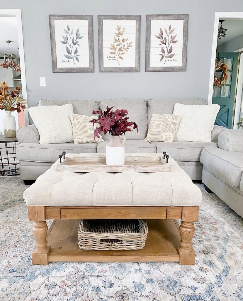 Here, the grey couch takes center stage, styled with pillows in warm neutrals that instantly make the space feel approachable and cozy. A tufted ottoman replaces the traditional coffee table, adding both softness and functionality. The woven basket beneath is a smart touch, offering extra storage without sacrificing style. Above the sofa, three framed botanical prints provide timeless inspiration for wall decoration—a reminder the best decor ideas often make the greatest statement. The neutral colors of the rug and accessories provide harmony, making the layout just as ideal for the smallest of spaces or the spacious home.