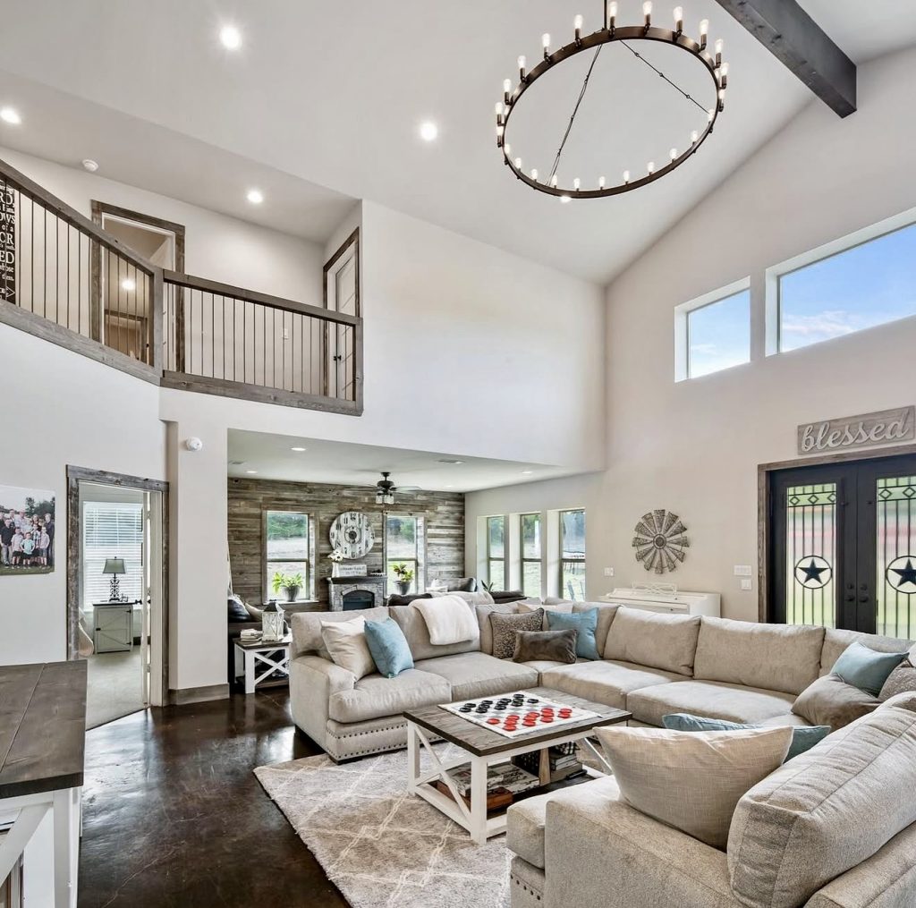 This living room embraces scale and airiness, and it proves farmhouse style isn’t reserved just for cottages—it suits expansive spaces just as well. Oversized chandelier and double-height ceilings make the room dramatic, but the oversized sectional makes it humble and comfortable. Distressed wood trims on the entryways and the tv wall provide rustic coziness, and splashes of blue pillows bring freshness to the neutral palettes. Thoughtful placement makes the room inviting, even despite the dramatic scale. For anyone fantasizing about decor ideas balancing farmhouse flair and open-concept living, this space serves as the perfect template.