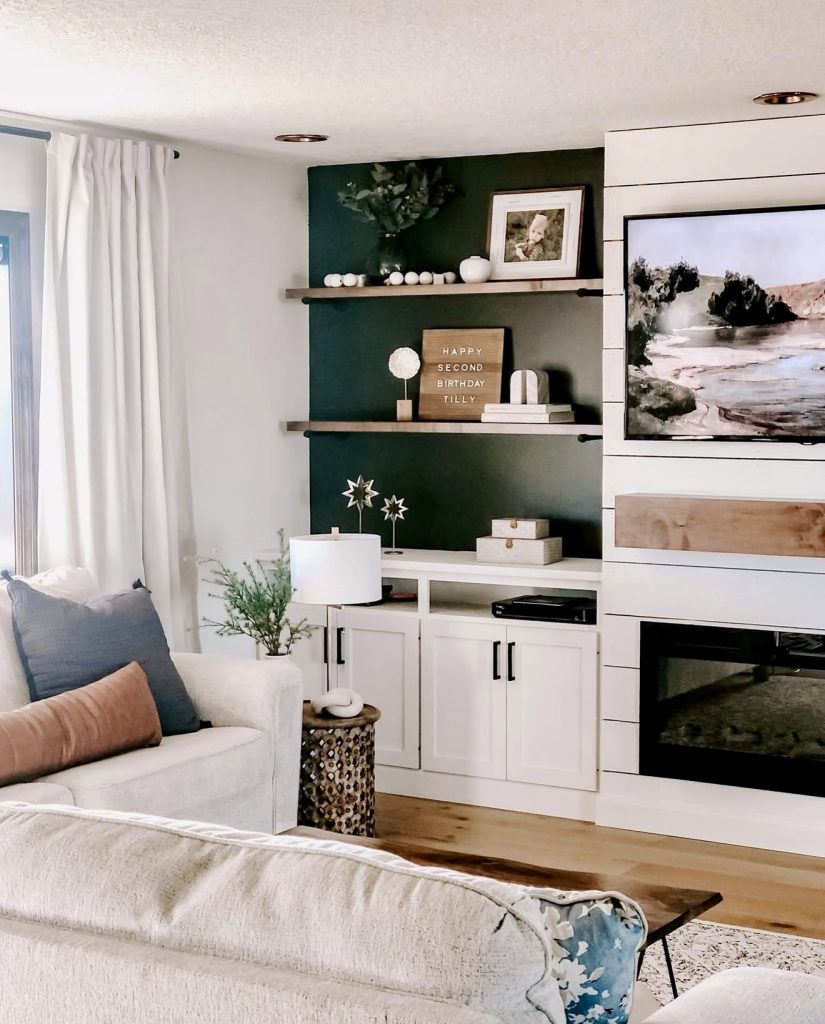 This design proves bold, dark accents can update the modern farmhouse living room without overwhelming it. Deep feature wall behind the shelves adds the illusion of depth and drama, making the white built-ins the spotlight. Firelight, paired with natural wood and stylized shelving, makes the perfect tv wall focal point. Textured details of pillows, throws, and greenery bring the warm touch of organics, and the tailored furniture makes the room balanced. Throw in floor-length curtains, and you have just the farmhouse room of contrasts—the perfect balance of coxy and current, providing fresh inspiration for anyone seeking the touch of contrast.