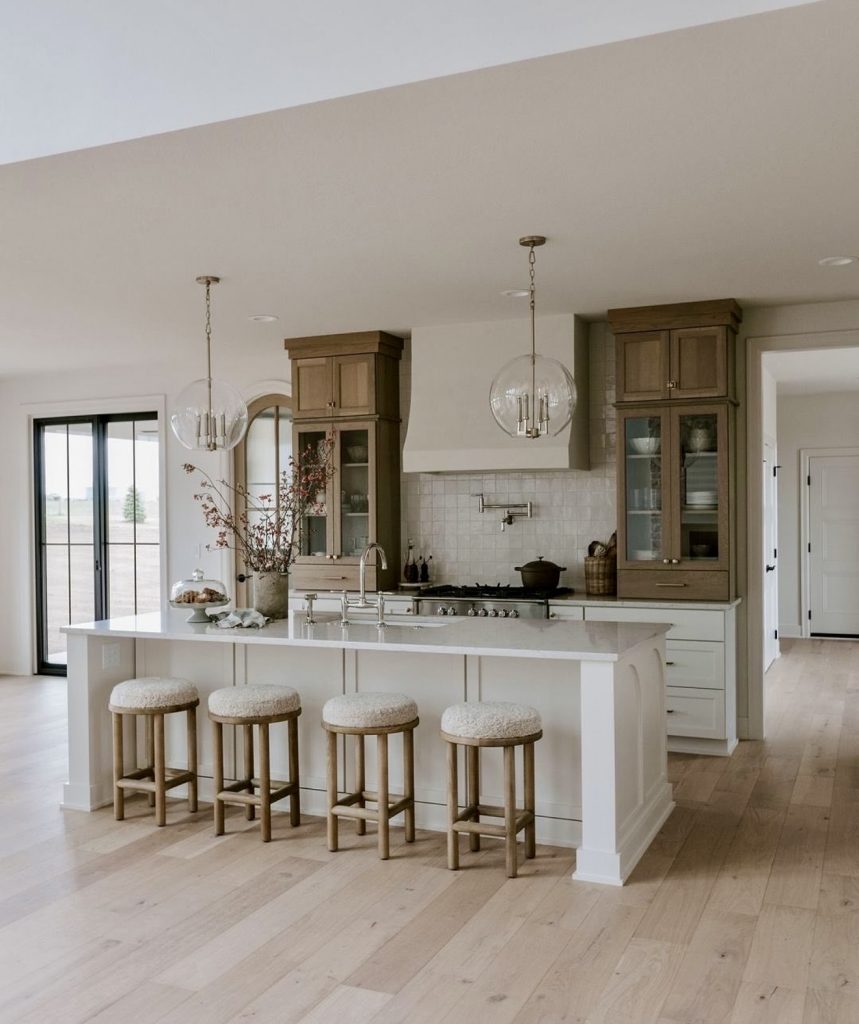 This kitchen embraces transitional elegance with its blend of white surfaces and soft earthy wood cabinets. The clean design highlights a large island that doubles as a gathering space, framed by rounded stools that invite conversation. Subtle rustic details, like the textured backsplash and glass-front cabinet design, give it timeless charm. The cozy lighting and open layout feel equally suited for weekday meals or relaxed entertaining. It’s a perfect reflection of design luxury in 2026, where warmth meets modern sophistication.
