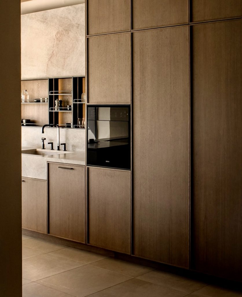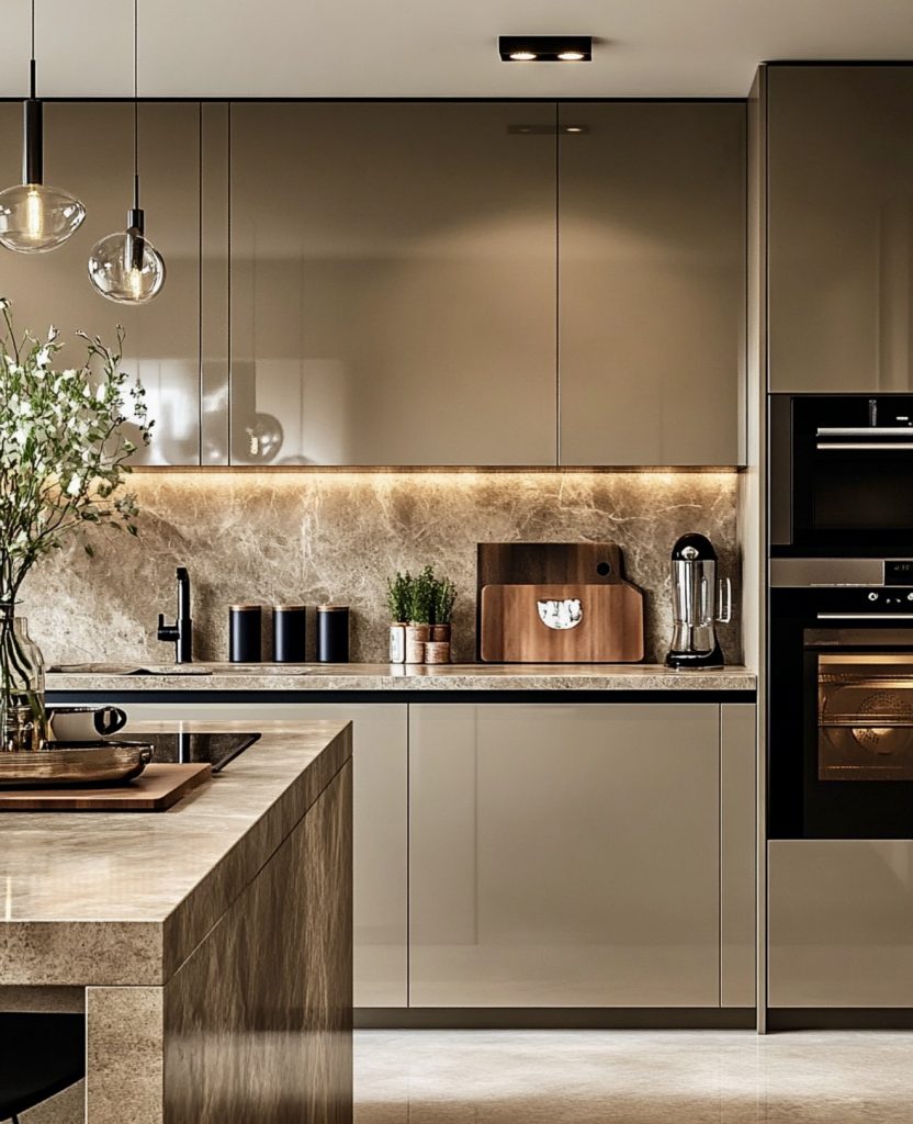 Here, muted beige and taupe wood tones create a balanced design that feels both organic and sophisticated. The vertical lines of the cabinet design add subtle rhythm, while dark fixtures bring a modern touch to the serene palette. It’s a space that embodies transitional elegance—not quite minimalist, not quite traditional, but perfectly in between. The atmosphere feels cozy yet elevated, inspired by Japanese simplicity and Nordic calm. This kitchen represents design luxury in 2026 at its most understated.