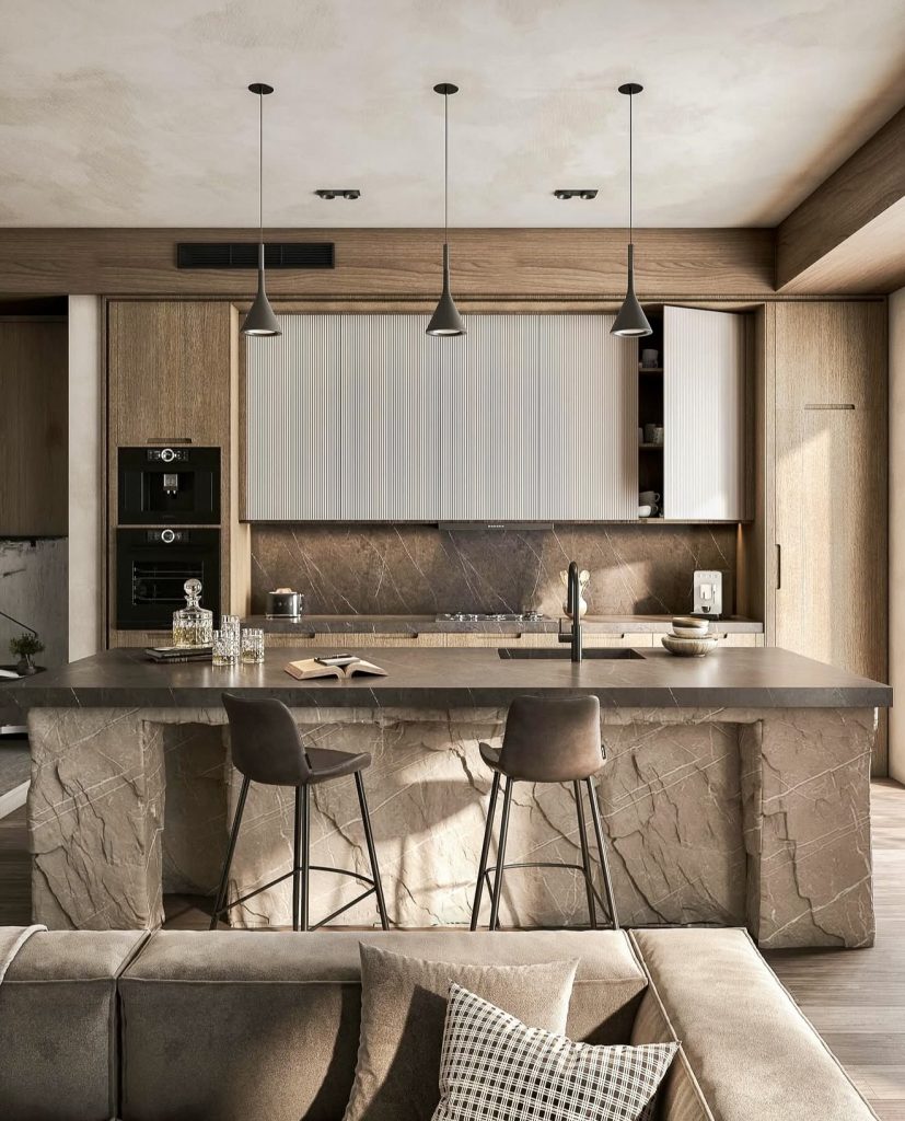 The warmth of sculpted stone kitchen islands and earthy palettes beautifully blends the luxe aesthetic of design and kitchen elegance. The cabinetry’s smoothness and the raw-textured islands create a calming juxtaposition. An organic modernism is felt. The outline is contemporary, and the pendant lights are matte. An open layout is a modern cozy feel for 2026. Wood cabinetry designed in a blend of neutral and earthy tones is both refined and tactile. The space is serene and inviting as craftsmanship celebrates the beauty of imperfections.
